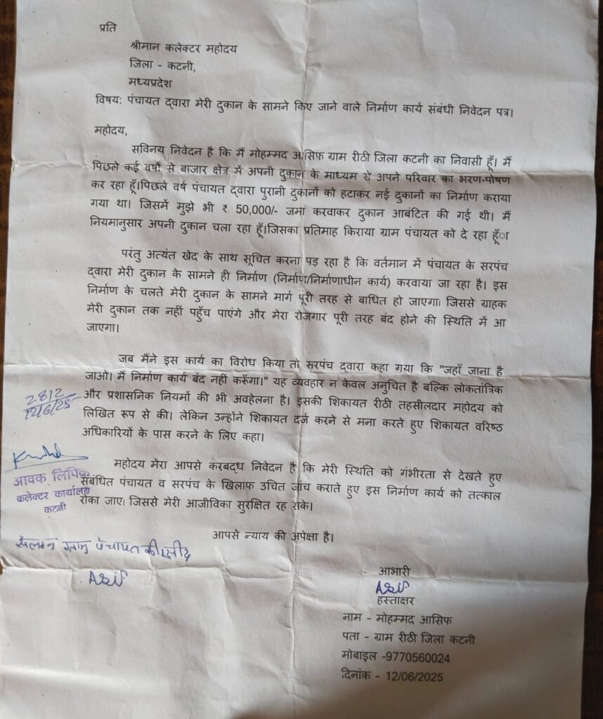 इस भेदभावपूर्ण कार्यवाही का सबसे बड़ा शिकार ग्राम रीठी निवासी मोहम्मद आसिफ हुए हैं, जिनकी वर्षों पुरानी दुकान को तोड़कर पंचायत द्वारा उन्हें नई दुकान तो दी गई, लेकिन अब उनकी दुकान के ठीक सामने नया निर्माण कार्य कराया जा रहा है। इस निर्माण के चलते उनकी दुकान पूरी तरह ढक जाएगी, जिससे उनका व्यवसाय प्रभावित होगा और रोज़गार का एकमात्र साधन बंद हो जाएगा।