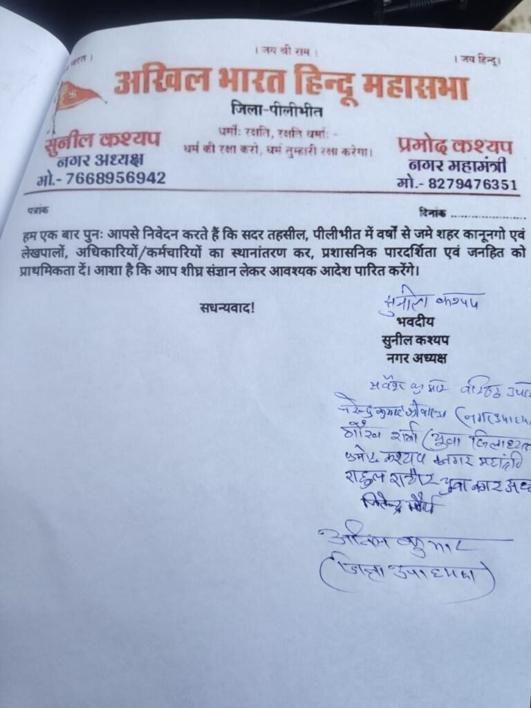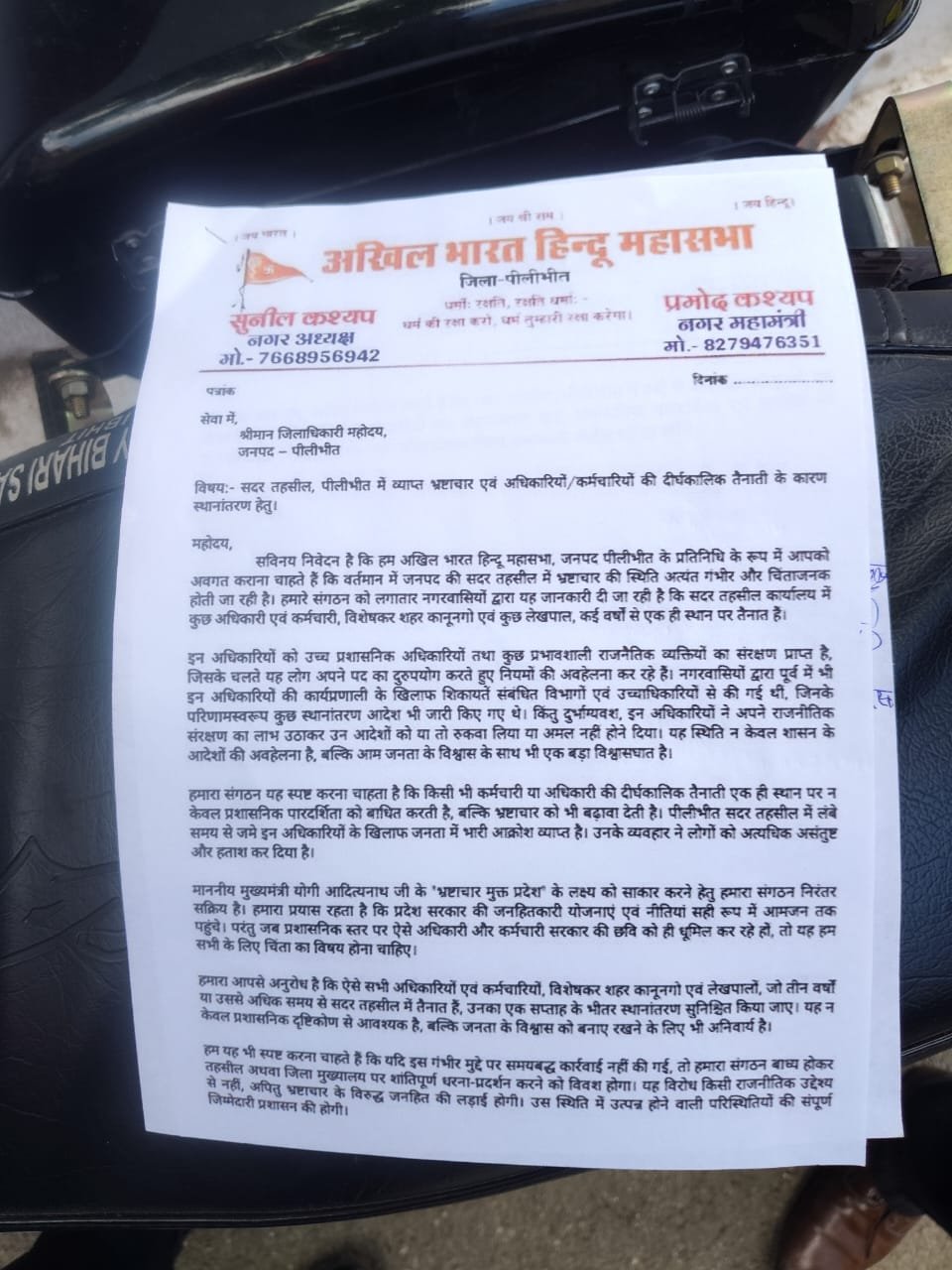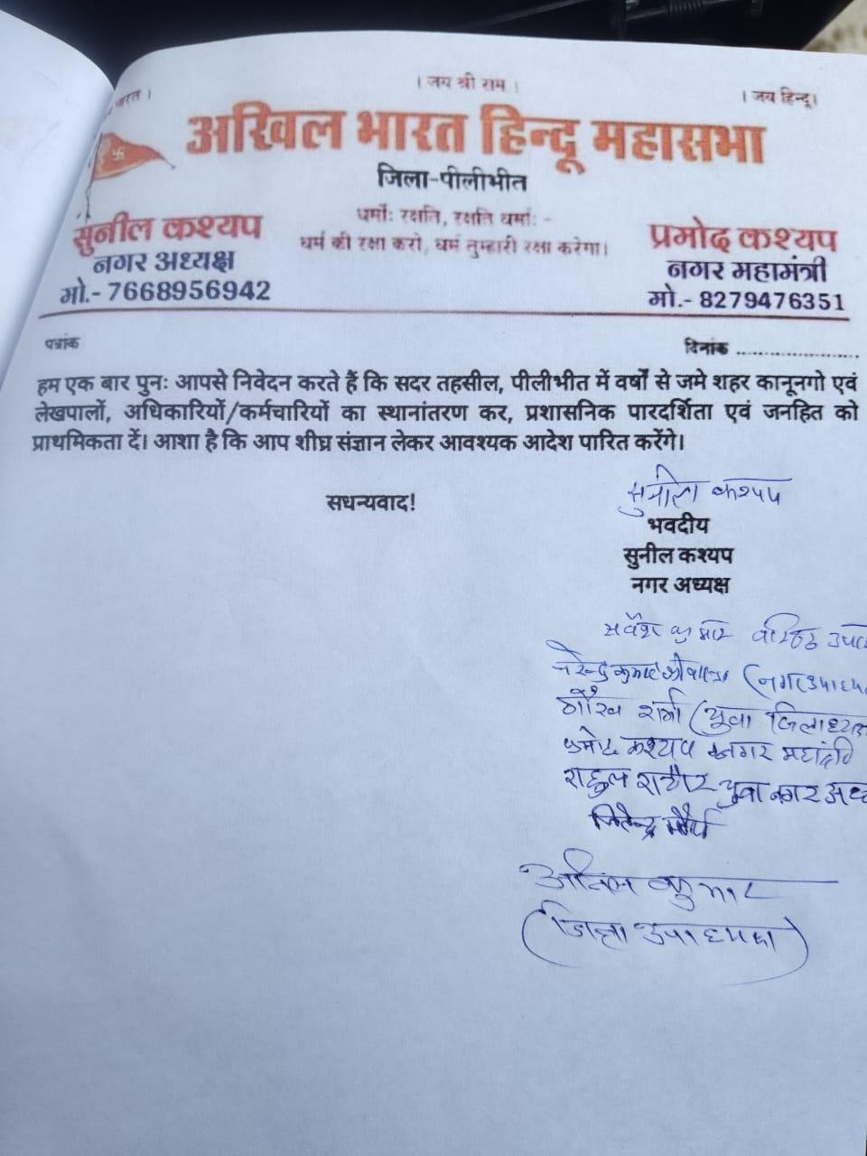 पीलीभीत। जनपद की सदर तहसील में व्याप्त भ्रष्टाचार, पारदर्शिता की कमी और अधिकारियों-कर्मचारियों की वर्षों से एक ही स्थान पर तैनाती को लेकर अखिल भारत हिंदू महासभा का प्रतिनिधिमंडल नगर अध्यक्ष सुनील कश्यप के नेतृत्व में गुरुवार को जिलाधिकारी कार्यालय पहुंचा और जिलाधिकारी महोदय को एक गंभीर एवं विस्तृत ज्ञापन सौंपा।
