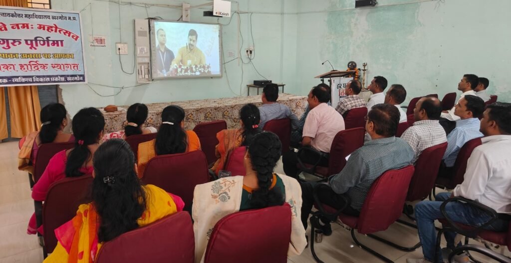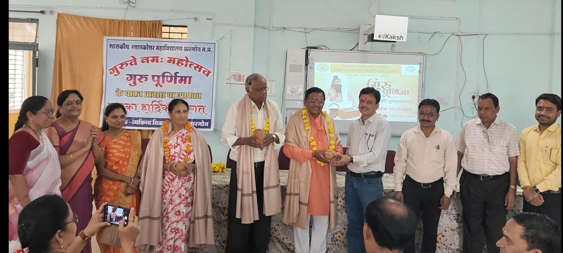 📝 खरगोन – गुरु पूर्णिमा के पावन अवसर पर 11 जुलाई को प्रधानमंत्री कॉलेज ऑफ एक्सीलेंस, क्रांति सूर्य टंट्या भील विश्वविद्यालय एवं विधि महाविद्यालय खरगोन के संयुक्त तत्वावधान में भारतीय ज्ञान परंपरा प्रकोष्ठ के अंतर्गत एक भव्य गुरु सम्मान समारोह का आयोजन किया गया। कार्यक्रम का शुभारंभ माँ सरस्वती की वंदना के साथ हुआ, जिसके पश्चात अतिथियों का पारंपरिक रूप से शॉल एवं श्रीफल भेंट कर अभिनंदन किया गया।