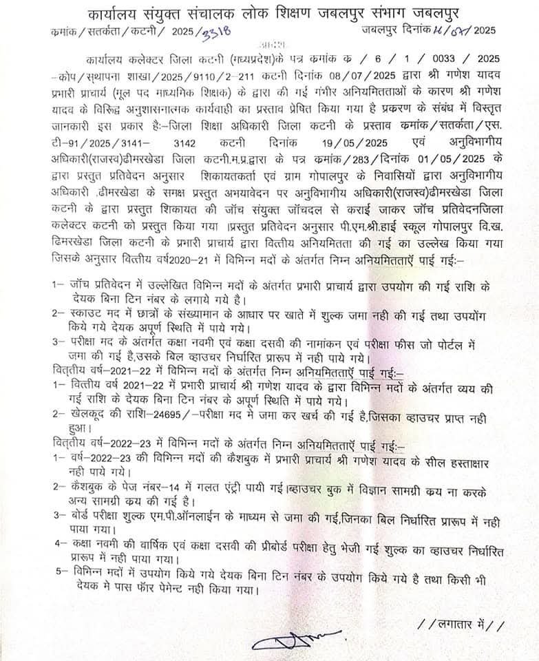 कटनी – लोक शिक्षण जबलपुर संभाग के संयुक्त संचालक अरूण कुमार इंगले ने विकासखंड ढीमरखेडा के गोपालपुर स्थित पीएमश्री हाई स्कूल के प्रभारी प्राचार्य श्री गणेश यादव को गंभीर वित्तीय अनियमितताओं के कारण निलंबित कर दिया है। निलंबन की यह कार्यवाही कलेक्टर श्री दिलीप कुमार यादव द्वारा प्रस्तावित अनुशासनात्मक कार्यवाही के बाद की गई है।