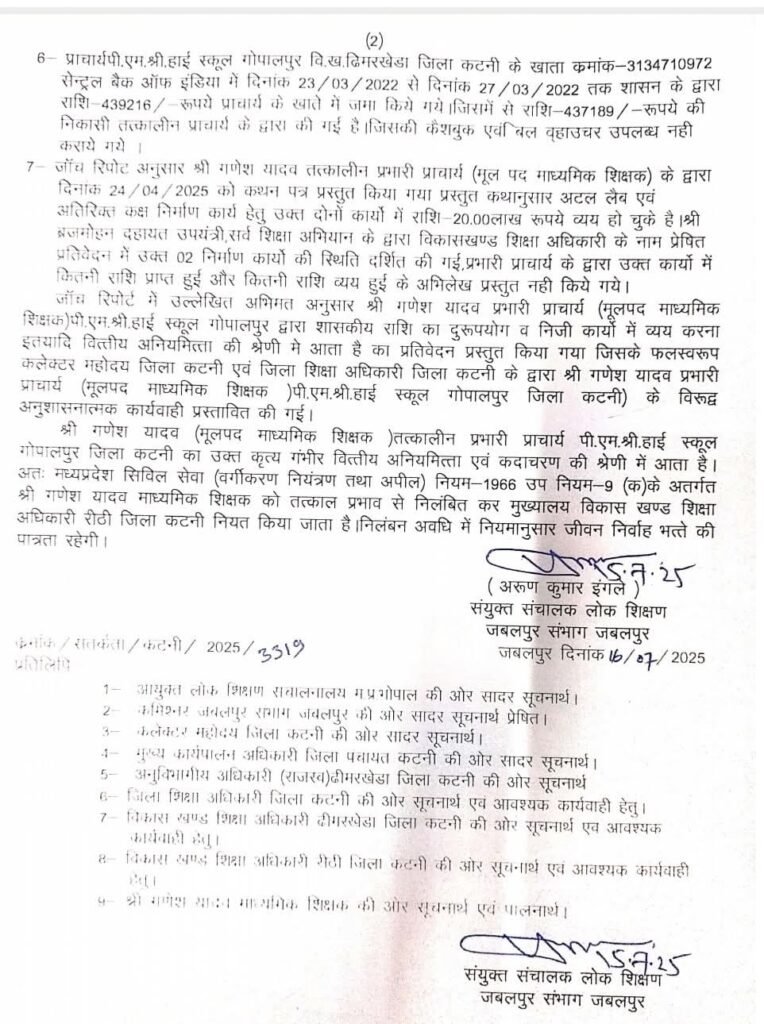 जांच प्रतिवेदन के आधार पर कलेक्टर श्री यादव द्वारा अनुशासनात्मक कार्यवाही के प्रस्ताव पर लोक शिक्षण जबलपुर संभाग के संयुक्त संचालक श्री इंगले ने प्रभारी प्राचार्य श्री यादव उक्त कृत्य गंभीर वित्तीय अनियमित्ता एवं कदाचरण की श्रेणी में पाये जाने पर मध्यप्रदेश सिविल सेवा (वर्गीकरण नियंत्रण तथा अपील) नियम 1966 उप नियम-9 (क) के अतर्गत श्री यादव को तत्काल प्रभाव से निलंबित कर मुख्यालय विकास खण्ड शिक्षा अधिकारी रीठी जिला कटनी नियत कर दिया गया है। निलंबन अवधि में नियमानुसार जीवन निर्वाह भत्ते की पात्रता रहेगी।