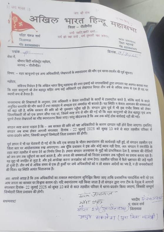पीलीभीत। शहर में लंबे समय से एक ही पद पर जमे अधिकारियों और लेखपालों के खिलाफ अखिल भारत हिन्दू महासभा ने कड़ा रुख अपनाया है। शनिवार को संगठन के जिलाध्यक्ष पंडित पंकज शर्मा के नेतृत्व में एक प्रतिनिधिमंडल ने सिटी मजिस्ट्रेट को एवं तहसील दिवस में पहुंचकर वहां मौजूद अधिकारियों को भी ज्ञापन सौंपते हुए चेतावनी दी कि यदि शीघ्र स्थानांतरण की कार्रवाई नहीं की गई, तो 22 जुलाई 2025 को सुबह 10 बजे से सदर तहसील परिसर में धरना-प्रदर्शन किया जाएगा।