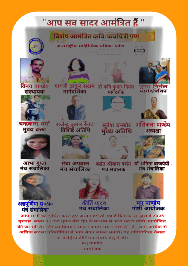 साहित्यिक मित्र मंडल,जबलपुर समूह 1,2,3,4,5 में गूगल मीट ऐप के माध्यम से काव्य गोष्ठी का आयोजन किया जाएगा।