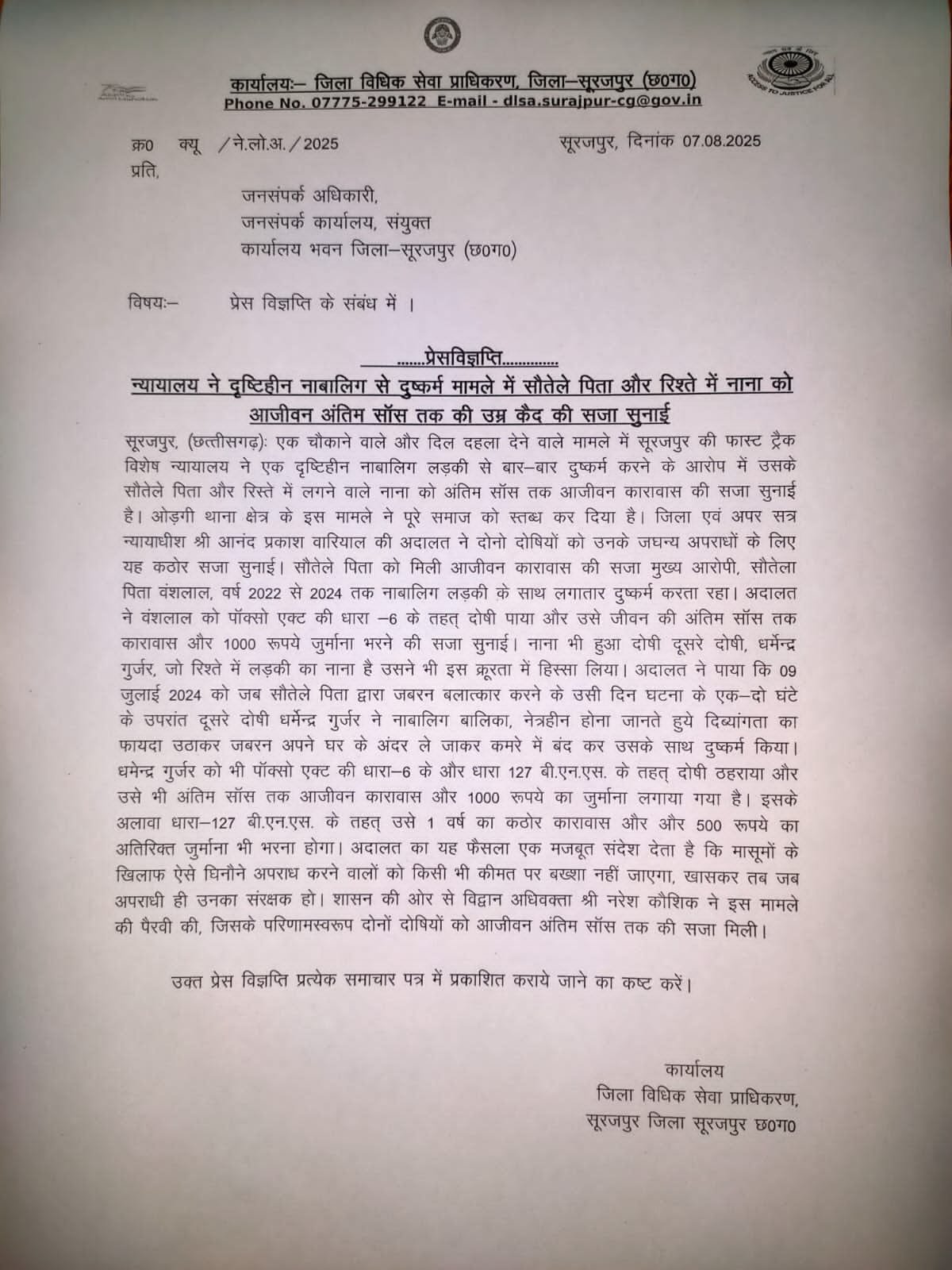 न्यायालय ने दृष्टिहीन नाबालिग से दुष्कर्म मामले में सौतेले पिता और रिश्ते में नाना को आजीवन अंतिम सॉस तक की उम्र कैद की सजा सुनाई