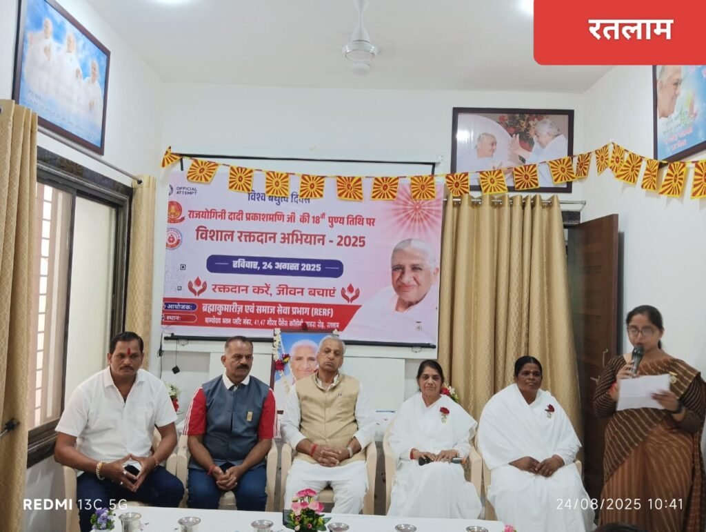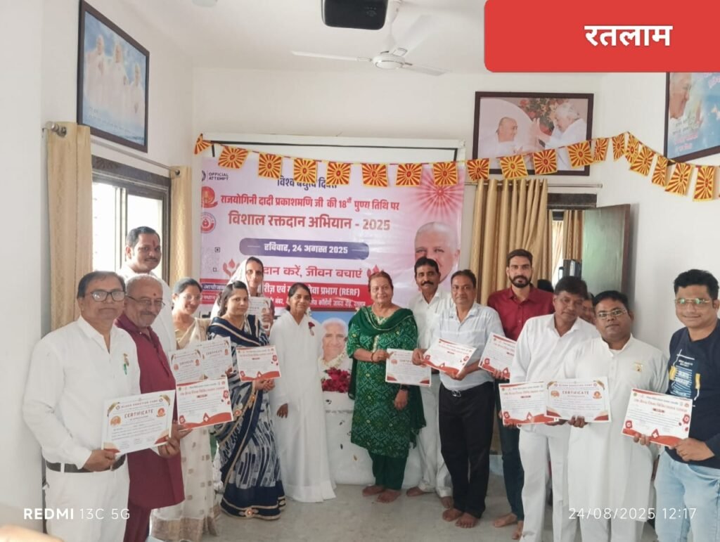 पूर्व मुख्य प्रशासिका राजयोगिनी दादी प्रकाशमणि जी की 18वीं पुण्यतिथि (25 अगस्त 2025) और विश्व बंधुत्व दिवस के उपलक्ष्य में समाजसेवा प्रभाग द्वारा भारत और नेपाल के सेवाकेंद्रों पर 22 और 25 अगस्त तक दो दिवसीय विशाल रक्तदान शिविर आयोजित किए जा रहे हैं। अभियान के तहत 1 लाख यूनिट रक्तदान का संकल्प लिया गया है।
