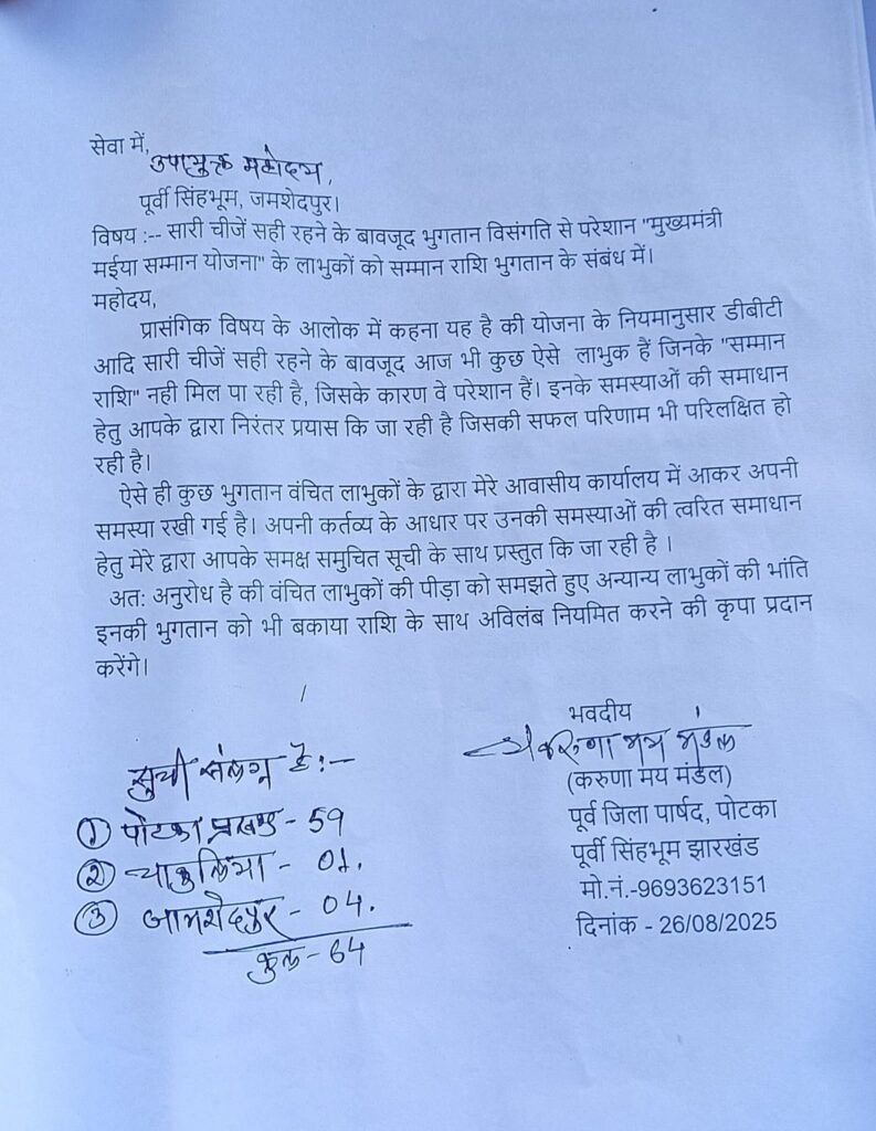 मईया सम्मान योजना की भुगतान विसंगति से जूझ रही लाभुकों की चतुर्थ शिकायत सूची जिला उपायुक्त पूर्वी सिंहभूम को सौंपे पोटका के पूर्व जिला पार्षद करुणा मय मंडल।