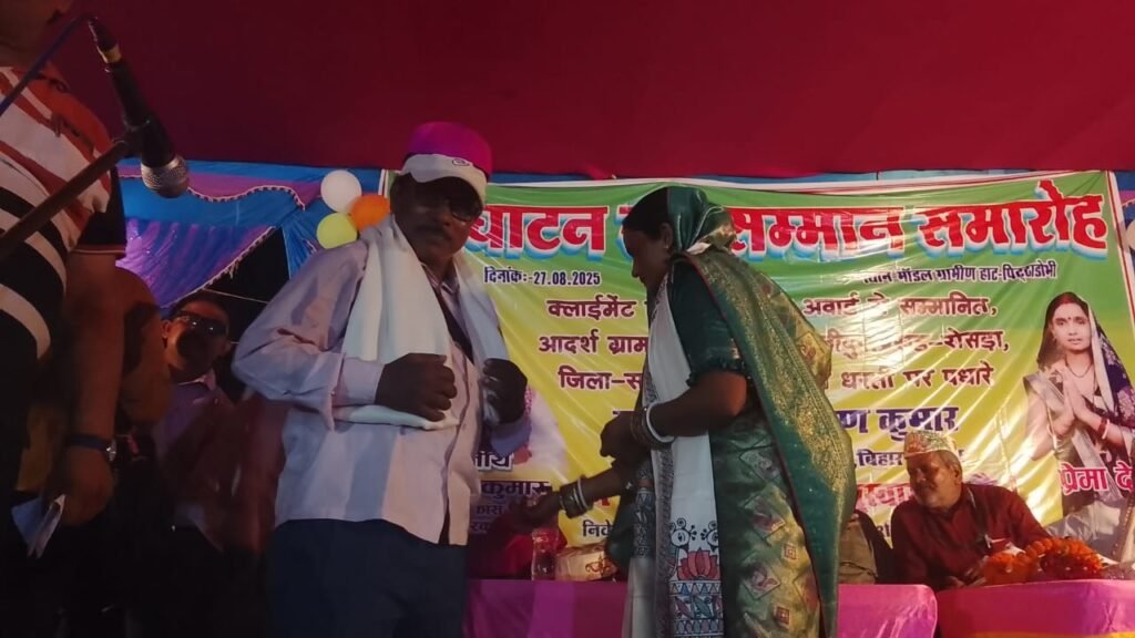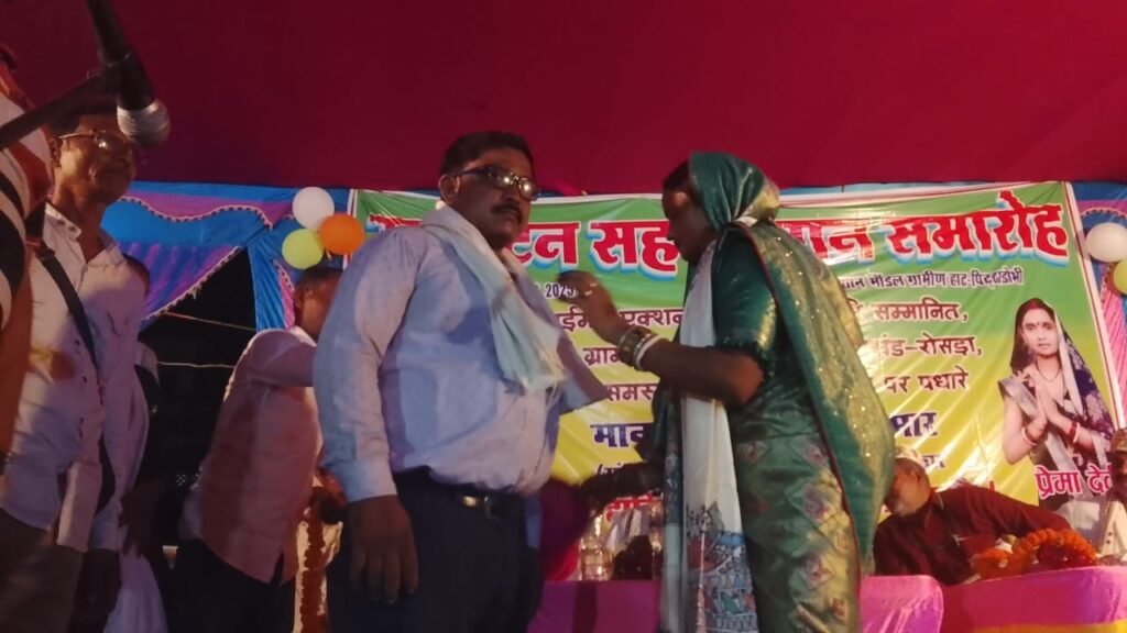 रोसड़ा प्रखंड अंतर्गत मोतीपुर पंचायत में आकांक्षी हाट का उद्घाटन करने पहुंचे बिहार सरकार के ग्रामीण विकास मंत्री श्रवण कुमार। उद्घाटन के पश्चात मोतीपुर पंचायत सरकार भवन में मोतीपुर के मुखिया प्रेमा देवी एवं उनके पति समाजसेवी रंजीत साहनी के द्वारा स्वागत सह सम्मान समारोह का आयोजन भी किया गया। जहां मोतीपुर के मुखिया प्रेमा देवी के द्वारा मंत्री जी को बुके एवं मिथिला के पारंपरिक चादर और पाग से सम्मानित किया गया इस दौरान वहां पहुंचे सभी प्रिंट एवं इलेक्ट्रॉनिक मीडियाकर्मी को भी चादर और पाग से सम्मानित किया गया। बताते चले कि यह वही मोतीपुर पंचायत है जिसके मुखिया प्रेमा देवी को नानाजी देशमुख राष्ट्रीय गौरव अवॉर्ड, राष्ट्रपति अवार्ड एवं प्रधानमंत्री जी के द्वारा क्लाइमेट एक्शन अवार्ड से भी सम्मानित किया गया था। पूरे देश भर में ढाई लाख से अधिक पंचायत में यह मोतीपुर पंचायत अपना परचम लहराते हुए अपने विकास को लेकर तीसरे स्थान पर है। वही स्वागत और उद्घाटन के पश्चात मंत्री जी ने पत्रकारों से बातचीत करते हुए कहा कि सब्जी उत्पादक किसानों के लिए हमारी सरकार लगातार प्रयासरत है और उनके लिए कोल्ड स्टोर की व्यवस्था भी करने में जुटी हुई है। साथ ही हत्या रेप बलात्कार जैसी घटना पर मंत्री जी ने कहा कि हमारी सरकार में एक भी अपराधी को बक्सा नहीं जाएगा सभी को जेल भेजा जाएगा। लेकिन जब उनसे पूछा गया प्रशांत किशोर का कहना है कि इस बार बिहार में भाजपा और जदयू की जमानत जप्त हो जाएगी तो मंत्री जी प्रशांत किशोर का नाम सुनते ही वहां से भाग खड़े हुए