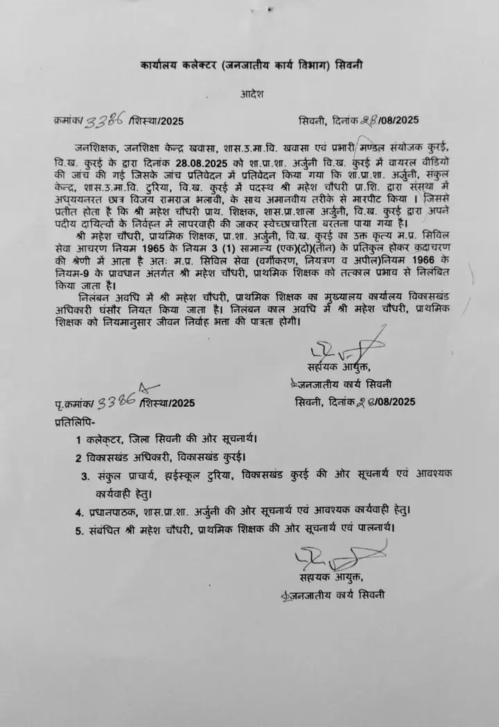 सिवनी- मध्यप्रदेश के सिवनी ज़िले के कुरई विकासखंड की प्राथमिक शाला अर्जुनी से एक शर्मनाक और हैरान कर देने वाला मामला सामने आया है। यहां पदस्थ शिक्षक महेश चौधरी द्वारा छात्र की बेरहमी से पिटाई का वीडियो सोशल मीडिया पर तेजी से वायरल हुआ। वीडियो सामने आने के बाद विभाग हरकत में आया और शिक्षक को तत्काल प्रभाव से निलंबित कर दिया गया।