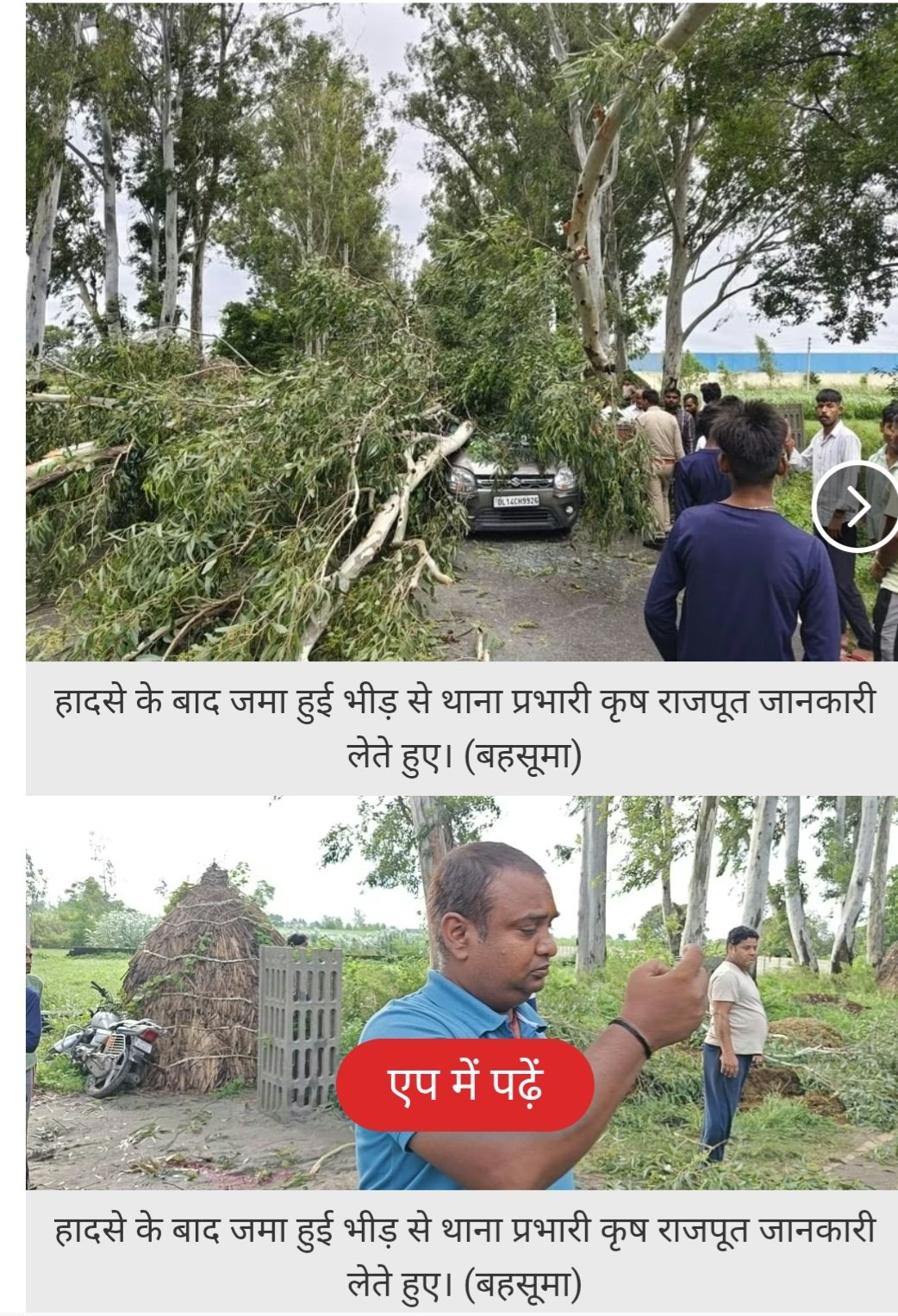 - बहसूमा (मेरठ)। मूसलाधार बारिश के बाद तेज हवा चलने से मेरठ-मवाना मार्ग पर गांव रहमापुर के नजदीक सड़क किनारे खड़े यूकेलिप्टिस के पेड़ गिरने से दो लोगों की मौत हो गई।पेड़ से नीचे एक कार भी दब गई लेकिन उसमें सवार लोगों को कोई खरोंच नहीं आई। पेड़ गिरने मार्ग बंद हो गया और दोनों तरफ वाहनों की लंबी कतारें लग गई। हादसा शाम करीब सवार चार बजे हुआ।