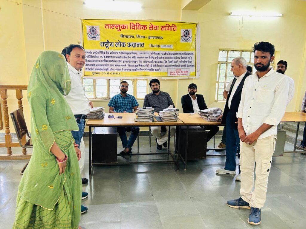 राष्ट्रीय विधिक सेवा प्राधिकरण नई दिल्ली एवं राजस्थान राज्य विधिक सेवा प्राधिकरण जयपुर के तत्वाधान में व जिला विधिक सेवा प्राधिकरण झालावाड़ के निर्देशन में दिनांक 13.09.2025 द्वितीय शनिवार को तालुका विधिक सेवा समिति (न्यायालय वरिष्ठ सिविल न्यायाधीश एवं अति. मुख्य न्यायिक मजिस्ट्रेट) चौमहला में बैंच अध्यक्ष न्यायाधीश श्री बृजपाल दान चारण की अध्यक्षता एवं बैंच सदस्य उपखंड अधिकारी श्री छत्रपाल चौधरी की सदस्यता में राष्ट्रीय लोक अदालत का हुआ आयोजन।