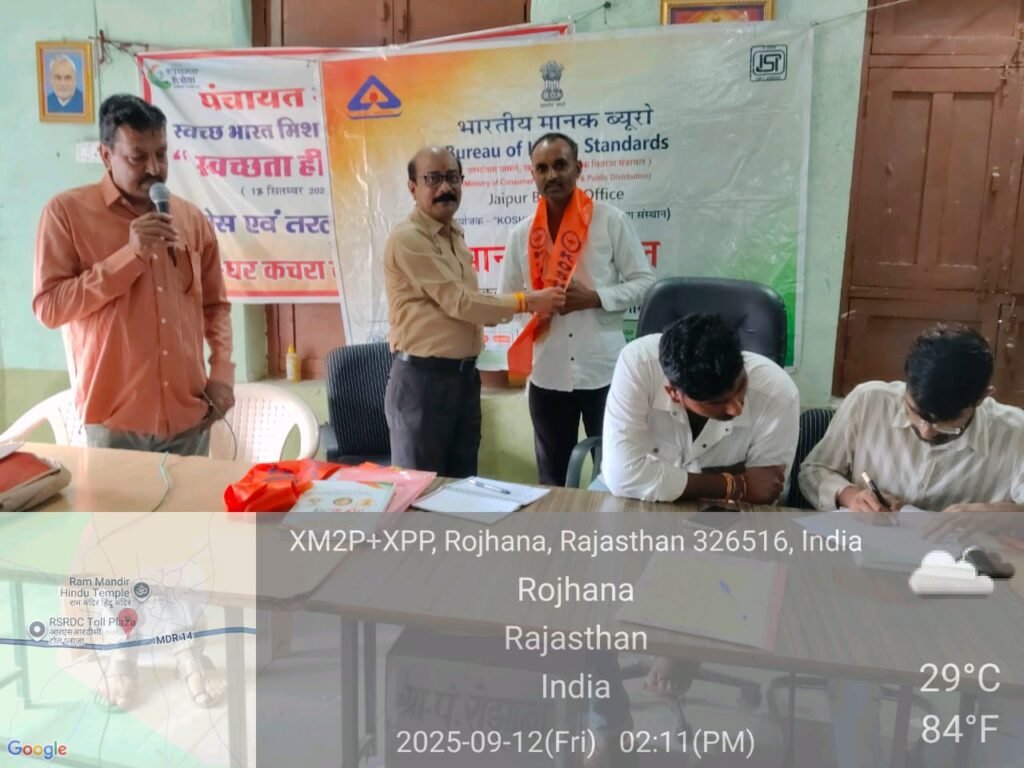 “स्वास्थ्य एवं पर्यावरण के हितार्थ मानक वस्तुऐं लें” पंकज शर्मा। भारतीय मानक ब्यूरो जयपुर शाखा के निर्देशानुसार झालावाड़ की ग्राम पंचायत रोझाना में “मानक चौपाल” का आयोजन किया गया। कार्यक्रम में मुख्य अतिथि लाल कुंवर, अध्यक्षता का ग्राम विकास अधिकारी व सचिव हरिमोहन मीणा, सरपंच प्रतिनिधि शिवराज सिंह, वार्ड पंच श्याम सिंह तथा पंचायत के कर्मचारी शंकर लाल तथा समाजसेवी व उपभोक्ता के क्षेत्र में कार्यरत नरेश निगम आदि उपस्थित रहे।