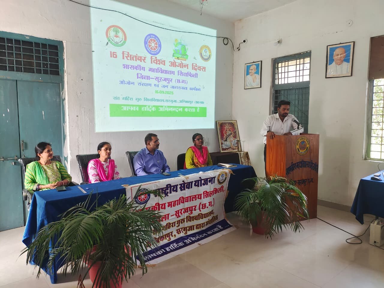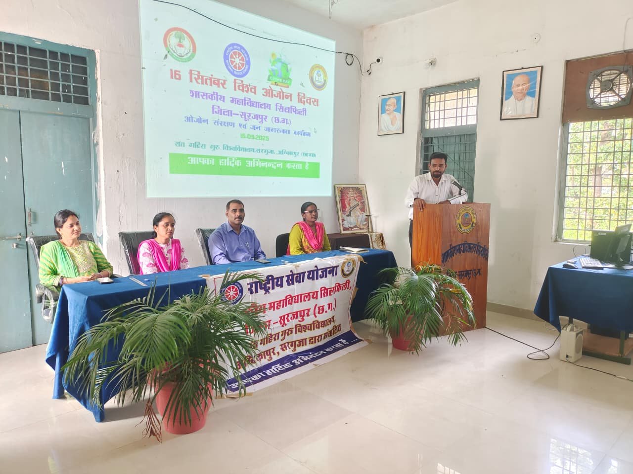 सूरजपुर/16 सितंबर 2025/ शासकीय महाविद्यालय सिलफिली में अंतर्राष्ट्रीय ओजोन दिवस का आयोजन प्राचार्य श्री अमित सिंह बनाफर की अध्यक्षता में किया गया। कार्यक्रम का संचालन एनएसएस कार्यक्रम अधिकारी श्रीमती शालिनी शांता कुजूर के द्वारा किया गया। उन्होंने बताया कि कि आज के दिन 16 सितंबर को पूरे विश्व में ओजोन दिवस के रूप में मनाया जाता है। ओजोन परत के संरक्षण के लिए अंतर्राष्ट्रीय ओजोन दिवस घोषित किया गया है। ओजोन परत को नष्ट करने वाले पदार्थ के लिए कनाडा के मॉन्टियल प्रोटोकॉल पर 16 सितंबर 1987 को हस्ताक्षर किए जाने  की स्मृति में मनाया जाता है। यह दिन ओजोन परत के महत्व को बताने एवं लोगों में जागरूकता बढ़ाने, इसके क्षय करने वाले पदार्थों के उपयोग को कम करने के प्रयासों पर जोर देने के लिए मनाया जाता है। ओजोन परत पृथ्वी पर जीवन के लिए अत्यंत महत्वपूर्ण है।