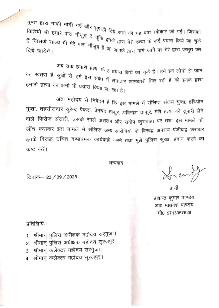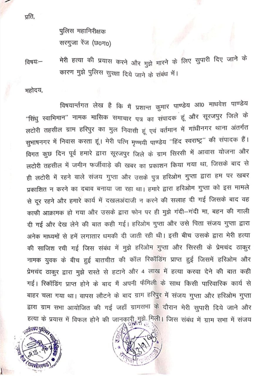 हिंद स्वराष्ट्र और सिंधु स्वाभिमान के संपादकों द्वारा लटोरी तहसीलदार सुरेंद्र पैंकरा के विरुद्ध कुछ खबरें पूरे सबूत के साथ प्रकाशित की गई थी जिसमें तहसीलदार सुरेंद्र पैंकरा द्वारा लापरवाहीपूर्वक या यूं कहे मिलीभगत के साथ फर्जी तरीके से बिना कलेक्टर परमिशन के और पटवारी प्रतिवेदन के बगैर ही जमीन की रजिस्ट्री कर दी थी। जिसके बाद सूरजपुर जिले की SDM शिवानी जायसवाल द्वारा तहसीलदार को 3 कारण बताओं नोटिस जारी की गई थी। जिसकी जांच रिपोर्ट आज भी लंबित हैं। इस मामले में लगातार धमकियां मिलने का सिलसिला जारी था। इस मामले का सीधा संबंध लटोरी तहसील के ग्राम हरिपुर निवासी संजय गुप्ता और हरिओम गुप्ता से था। ये दोनों पिता पुत्र जमीन दलाली का कार्य करते हैं और इनके द्वारा ही तहसीलदार से सांठगांठ कर फर्जी तरीके से जमीन रजिस्ट्री का कार्य करवाया गया था।