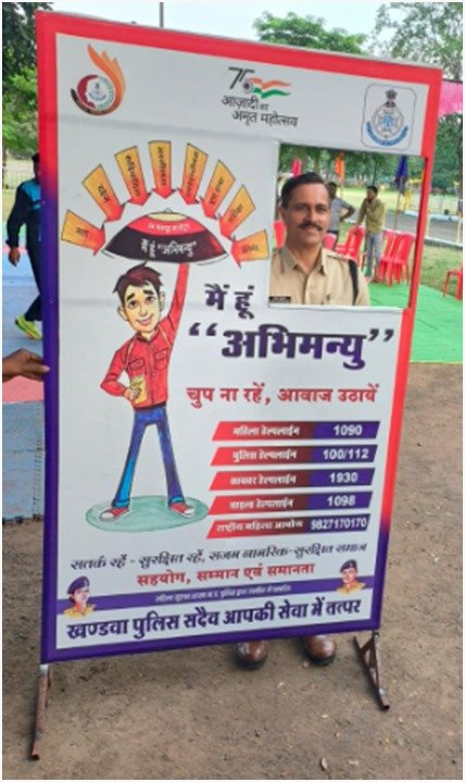 जिला खंडवा मे अभिमन्यु अभियान को सफल बनाने के लिए पुलिस अधीक्षक खंडवा श्री मनोज कुमार राय के निर्देशन मे तथा अतिरिक्त पुलिस अधीक्षक (शहर) श्री महेन्द्र तारणेकर व अतिरिक्त पुलिस अधीक्षक (ग्रामीण) श्री राजेश रघुवंशी के मार्गदर्शन मे नोडल अधिकारी उप पुलिस अधीक्षक अजाक श्री महेश कुमार दुबे को बनाया गया है। जिला पुलिस खंडवा के द्वारा प्रत्येक थाना क्षेत्र के प्रमुख स्कूल एवं कालेजों मे जाकर अनुविभागीय अधिकारी (पुलिस) एवं थाना प्रभारियों के माध्यम से “मै हूँ अभिमन्यु” कार्यक्रम किया जा रहा है। जिसके तहत मैं हूँ अभिमन्यु का सेल्फ़ी पॉइंट प्रमुख स्कूल, कालेज, मॉल, गरबा एवं दुर्गा पंडाल मे लगाया गया है। “मैं हूँ अभिमन्यु”मध्य प्रदेश पुलिस द्वारा एक परिवर्तनकारी पहल है जिसका उद्देश्य हमारे समाज में महिलाओं के साथ होने वाले अपराधों के खिलाफ जागरूकता बढ़ाना है। महिलाओं के खिलाफ अपराध अक्सर नशे की लत, दहेज प्रथा और पुरानी रूढ़िवादिता जैसी खतरनाक प्रथाओं में निहित होते हैं, जो सामूहिक रूप से हिंसा और उत्पीड़न को बढ़ावा देते हैं। यह पहल अभद्रता, असंवेदनशीलता और लिंग भेदभाव के शर्मनाक कृत्यों जैसे महत्वपूर्ण मुद्दों पर ध्यान आकर्षित करने का प्रयास करती है। बालिका भ्रूण की हत्या, अशिक्षा और महिलाओं को समाज में उनके उचित स्थान से वंचित करना हमारी प्रगति के लिए खतरा है। ये प्रथाएँ न केवल व्यक्तियों को नुकसान पहुँचाती हैं बल्कि हमारे समाज के नैतिक ताने-बाने को भी तोड़ती हैं। मैं हूँ अभिमन्यु के माध्यम से इन गहरी जड़ों वाली बुराइयों के बीच एक ऐसे समाज को बढ़ावा देना है जहाँ महिलाओं के साथ सम्मान और समानता का व्यवहार किया जाता है।