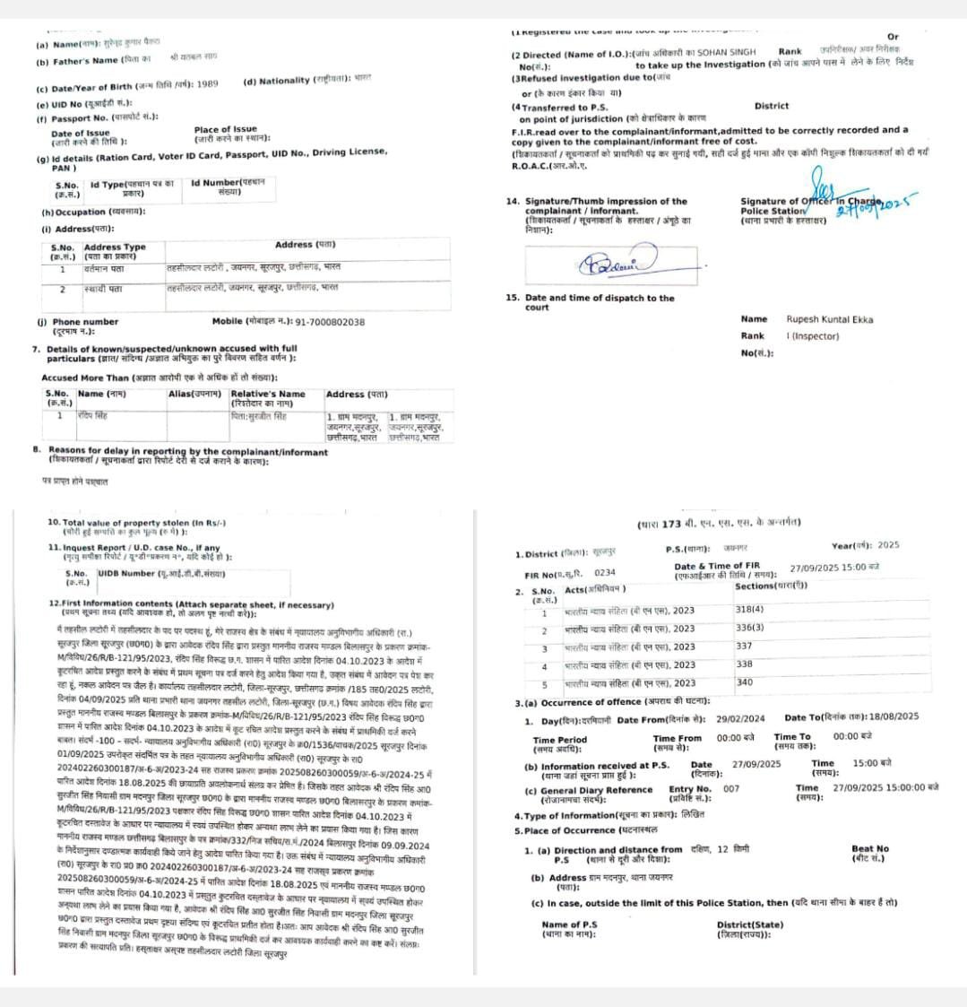 जिसमें दस्तावेज के जाली (Forgery) होने की पुष्टि हुई । तदनुसार संबंधित व्यक्ति श्री रंदिप सिंह आ सुरजीत सिंह के विरूद्ध प्राथमिकी (FIR) दर्ज कराने हेतु तहसीलदार लटोरी के माध्यम से थाना प्रभारी जयनगर, तहसील लटोरी, जिला सूरजपुर, (छ.ग) को आवेदन प्रेषित कर प्राथमिकी (FIR) दर्ज कर लिया गया है।