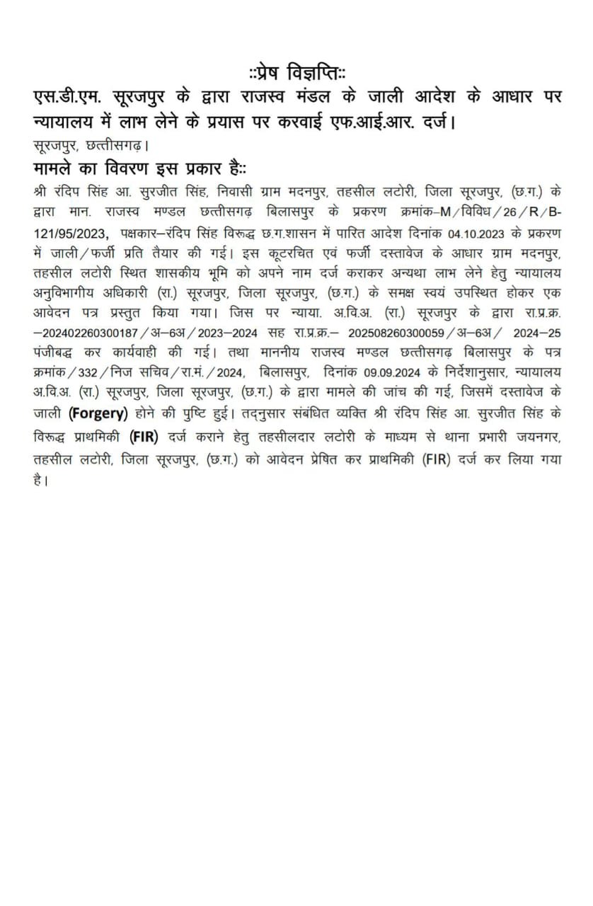 सूरजपुर 28 सितंबर 2025/ श्री रदिप सिंह, निवासी ग्राम मदनपुर, तहसील लटोरी के द्वारा मान राजस्व मण्डल छत्तीसगढ़ बिलासपुर के प्रकरण क्रमांक-M/ विविध /26/R/B-121/95/2023, पक्षकार-रदिप सिंह विरूद्ध छग शासन में पारित आदेश दिनांक 04.10.2023 के प्रकरण में जाली फर्जी प्रति तैयार की गई। इस कूटरचित एवं फर्जी दस्तावेज के आधार ग्राम मदनपुर, तहसील लटोरी स्थित शासकीय भूमि को अपने नाम दर्ज कराकर अन्यथा लाभ लेने हेतु न्यायालय अनुविभागीय अधिकारी (रा) सूरजपुर, जिला सूरजपुर, (छ.ग.) के समक्ष स्वयं उपस्थित होकर एक आवेदन पत्र प्रस्तुत किया गया। जिस पर न्याया. अ.वि.अ. (रा.) सूरजपुर के द्वारा रा.प्र.क्र.रा.प्र.क्र.-202508260300059 / अ-63 / 2024-25पंजीबद्ध कर कार्यवाही की गई। तथा नाननीय राजस्व मण्डल छत्तीसगढ़ बिलासपुर के पत्र क्रमांक/332/निज सचिव / रा.मं. / 2024, बिलासपुर, दिनांक 09.09.2024 के निर्देशानुसार, न्यायालय अ.वि.अ. (रा.) सूरजपुर, जिला सूरजपुर (छ.ग.) के द्वारा मामले की जांच की गई,