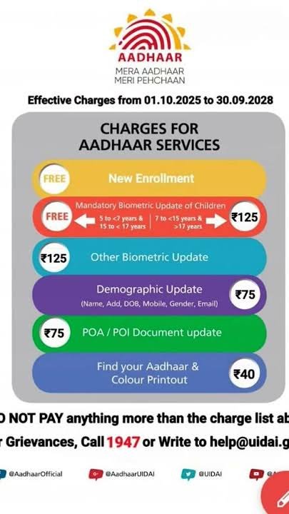 सूरजपुर/30 सितंबर 2025/ 01 अक्टूबर 2025 से 30 सितंबर 2028 तक विभिन्न आधार सेवाओं के लिए नया शुल्क प्रभावी होगा। यह बदलाव नागरिकों को बेहतर और अधिक कुशल सेवाएं प्रदान करने के उद्देश्य से किया गया है। नया शुल्क के अनुसार (5-7 वर्ष और 15-17 वर्ष) के लिए नया आधार नामांकन और अनिवार्य बायोमेट्रिक अपडेट पूरी तरह से निःशुल्क रहेंगे। वयस्कों के लिए अन्य बायोमेट्रिक अपडेट (जैसे, उंगलियों के निशान, आईरिस स्कैन) की शुल्क 125 रू. होगी।