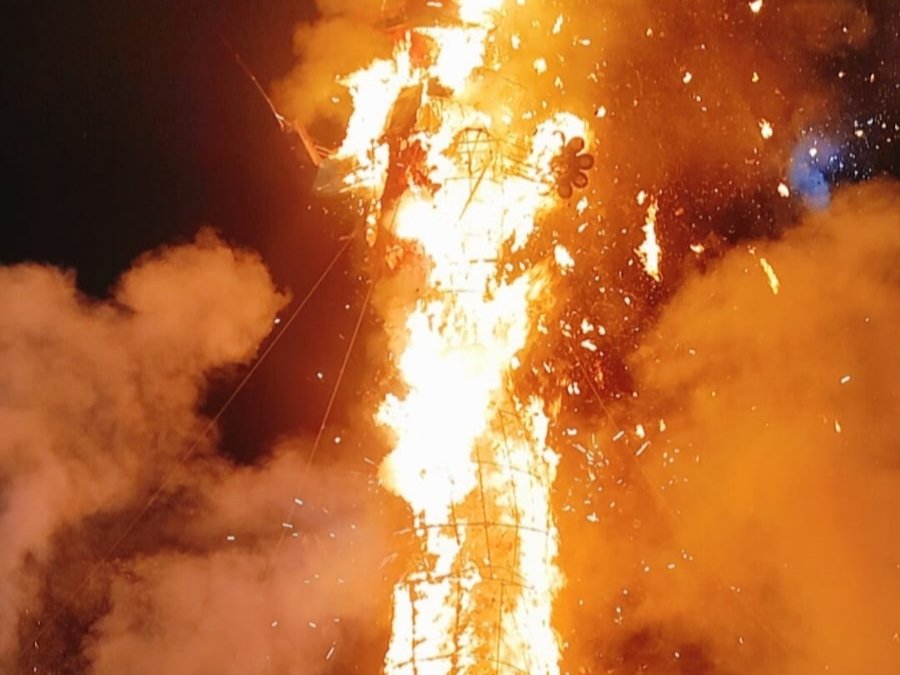 मंत्री खटीक ने रिमोट का बटन दबाकर विशालकाय रावण, 55 फुट पुतलों का दहन किया। जैसे ही आग की लपटों ने पुतलों को अपनी चपेट में लिया, ‘जय श्री राम’ के उद्घोष से पूरा मैदान गूँज उठा।