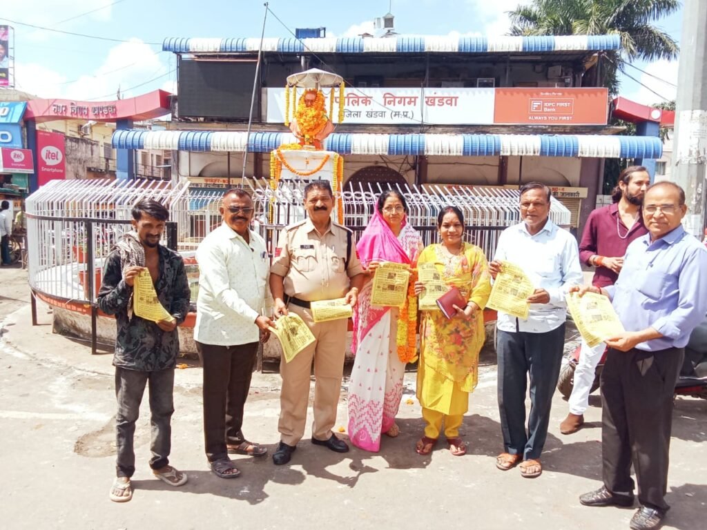 खंडवा।। गांधी जयंती पर दादाजी नशा मुक्ति केंद्र की संचालिका अनिता सिंह चौहान समाज सेवी सुनील जैन स्वास्थ विभाग सेएच आर शर्मा,,द्वारा गांधी जयंती पर नगर निगम चौराहे पर स्थित महात्मा गांधी जी की प्रतिमा पर माल्यार्पण कर मद्य निषेध सप्ताह का शुभारंभ किया। इस अवसर पर उन्होंने कहा कि गांधी जी के आदर्श आज भी समाज को मार्गदर्शन देते हैं और नशा मुक्ति की दिशा में उनके विचार अत्यंत प्रासंगिक हैं। नशे से मुक्त समाज ही सशक्त और स्वस्थ समाज का निर्माण कर सकता है। संस्था द्वारा यह अभियान 2 से 8 अक्टूबर तक चलाया जाएगा, जिसके अंतर्गत नगर में विभिन्न जागरूकता कार्यक्रम एवं गतिविधियाँ आयोजित की जाएंगी। कार्यक्रम में उपस्थित लोगों को नशा मुक्ति की शपथ दिलाई गई एवं जागरूकता हेतु पंपलेट वितरित किए गए। इस अवसर पर अनीता सिंह समाजसेवी सुनील जैन स्वास्थ्य विभाग से सिटी कोतवाली से रमेश सावनेर, पूर्व पार्षद खालिद पटेल , आकाश यादव, पूजा भट्ट एवं बजरंग मराठा सहित अनेक नागरिक उपस्थित रहे।