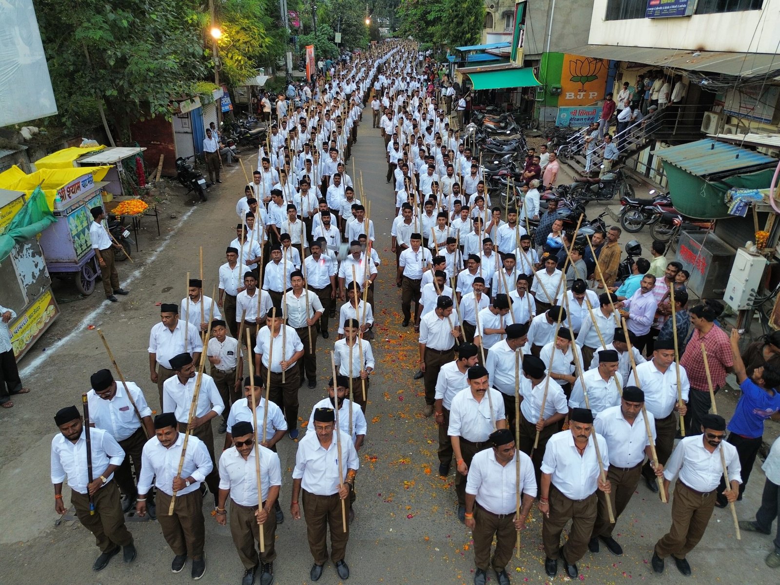 संघ के शताब्दी वर्ष पर निकला नगर में ऐतिहासिक पथ संचलन, पुष्पवर्षा कर शहर वासियों ने किया।