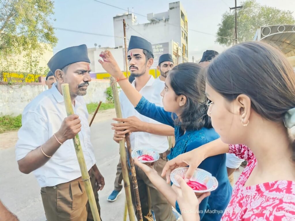 पथ संचलन के प्रारंभ में बालिकाओं द्वारा सभी स्वयंसेवकों के मस्तक पर लाल तिलक लगाकर मंगलकामनाएँ दी गईं।