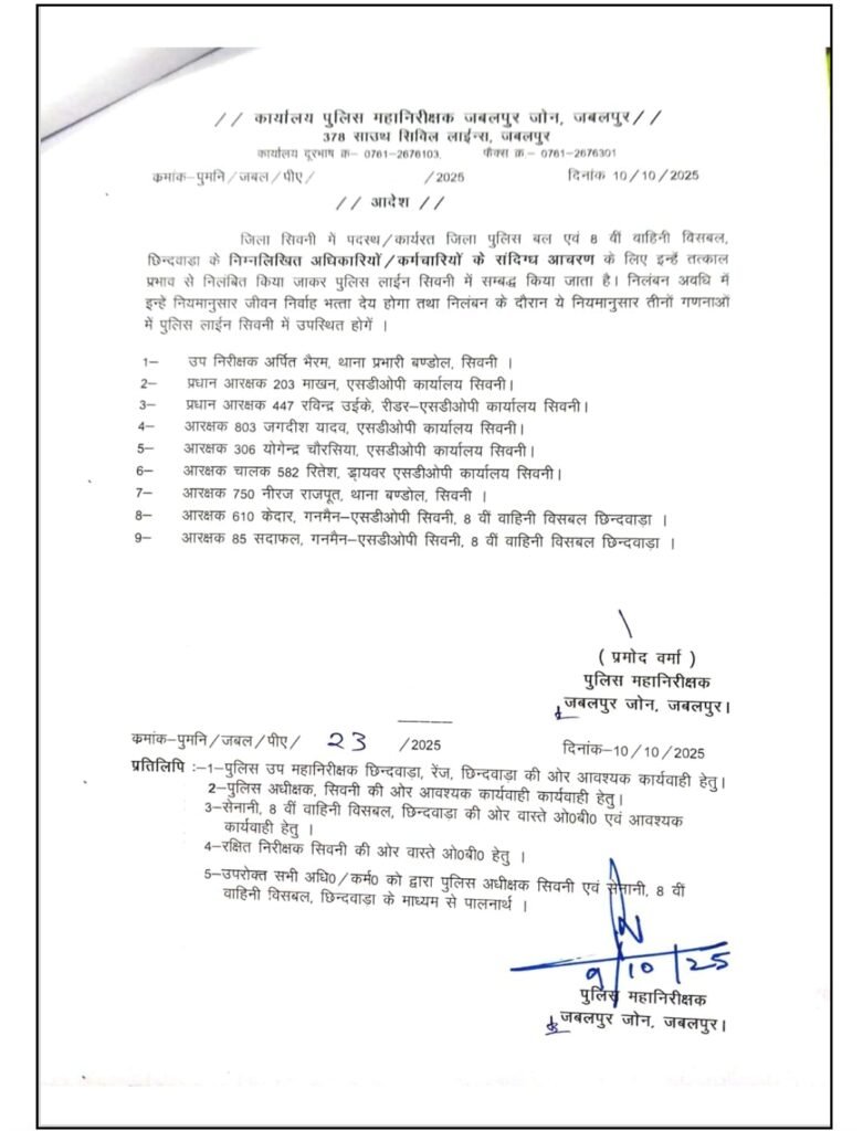 सिवनी – मध्यप्रदेश के सिवनी जिले से इस वक्त की बड़ी खबर सामने आ रही है, जहाँ जिला पुलिस बल सिवनी और छिंदवाड़ा में पदस्थ कुल 9 पुलिसकर्मियों को संदिग्ध आचरण के चलते तत्काल प्रभाव से निलंबित कर दिया गया है। इस कार्रवाई से पूरे पुलिस विभाग में हड़कंप मच गया है।