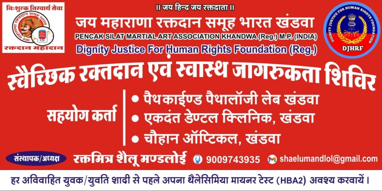 खण्डवा//जय महाराणा रक्तदान समूह भारत खंडवा के तत्वावधान में सिहाड़ा रोड़ स्थित MGM हाई सेकेंडरी स्कूल,खड़वा में 16 अक्टूबर गुरुवार को स्वैच्छिक रक्तदान शिविर के साथ स्वास्थ्य जागरूकता शिविर का आयोजन किया जा रहा है जिसमें..