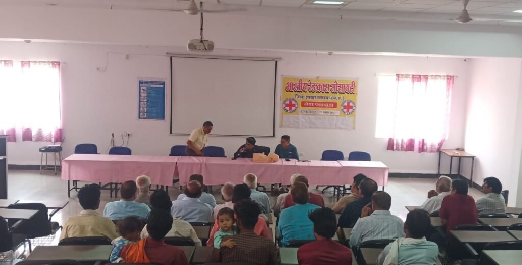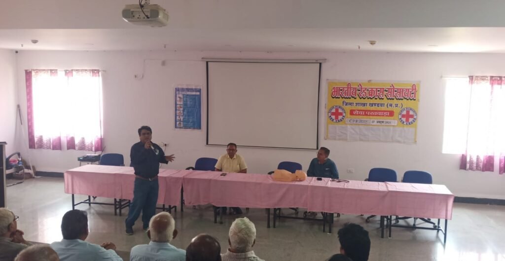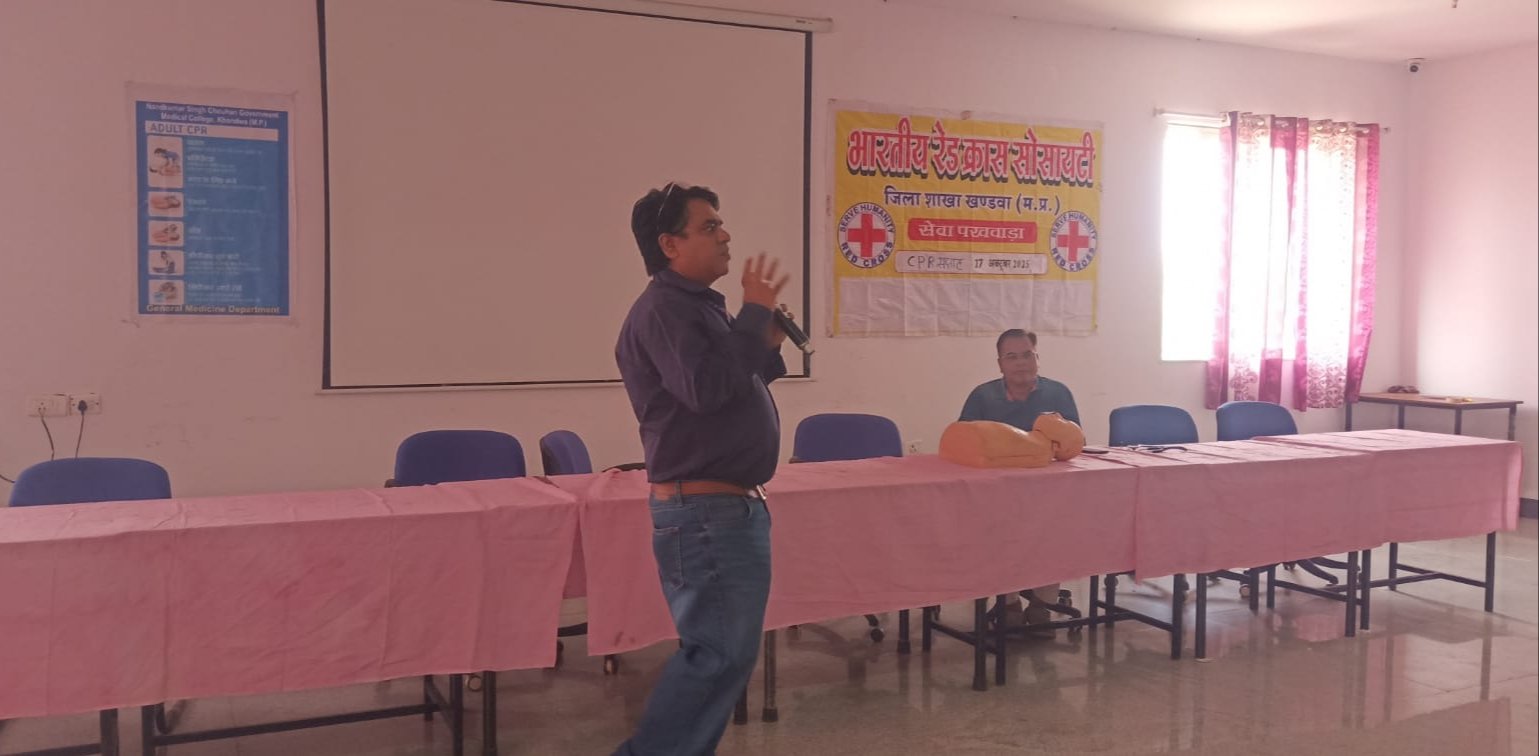 भारतीय रेड क्रॉस सोसाइटी खंडवा द्वारा सीपीआर सप्ताह के अंतर्गत भारतीय रेड क्रॉस सोसाइटी के सदस्य एवं सामाजिक कार्यकर्ताओं का प्रशिक्षण कार्यक्रम आयोजित किया गया जिसके अंतर्गत डॉ योगेश शर्मा महामारी विशेषज्ञ डॉक्टर रंजीत बडोले प्राध्यापक मेडिकल विभाग एवं मेडिकल सुपरीटेंडेंट मेडिकल कॉलेज खंडवा एवं डॉक्टर पंकज जैन एसोसिएट प्रोफेसर मेडिसिन विभाग मेडिकल कॉलेज खंडवा द्वारा सीपीआर का विस्तृत प्रशिक्षण प्रयोगिक पुतले के माध्यम से दिया गया उपस्थित सदस्यों की जिज्ञासा का समाधान भी आपके द्वारा किया गया। डॉ रंजीत बडोले जी द्वारा बताया गया कैसे हम इमरजेंसी में कॉलेप्स हुए व्यक्ति सीपीआर के माध्यम से उसकी जान बचा सकते हैं। ऐसा व्यक्ति जो बेहोश है जिसकी सांस रुक गई है और पल्स नहीं चल रही है ऐसे व्यक्ति को सीपीआर देकर उसे जीवनदान दिया जा सकता है इस महत्वपूर्ण कार्य को प्रशिक्षित कार्यकर्ता के माध्यम से आसान तरीके से किया जा सकता है। डॉ पंकज जैन ने बताया कि हम समाज में सामाजिक कार्यकर्ता के रूप में सीपीआर के माध्यम से इमरजेंसी में लोगों की जान बचा सकते हैं। कार्यक्रम में रेड क्रॉस सोसाइटी के सचिव भानु भाई पटेल सदस्य गण प्रमुख रूप से अखिलेश जी गुप्ता ,तरुण झंवर,एच आर पांडे, दिनेश अग्रवाल, प्रकाश वर्मा,राधेश्याम जी कुशवाह रविंद्र सिंह जी ,मनीष जायसवाल, रवि चौरे जी आदि उपस्थित थे। भारतीय रेड क्रॉस खंडवा के सचिव भानु भाई पटेल ने सभी चिकित्सकों का आभार माना।