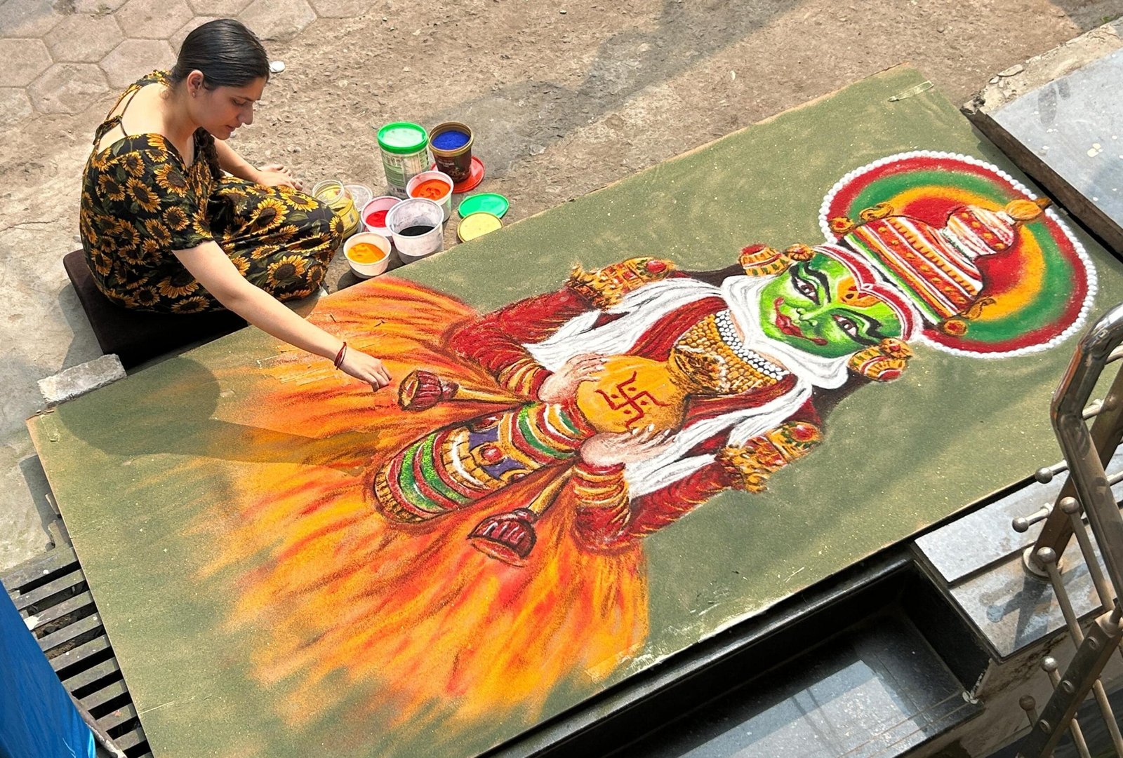 दीपावली की धनतेरस पर आकर्षक रंगोली का निर्माण।