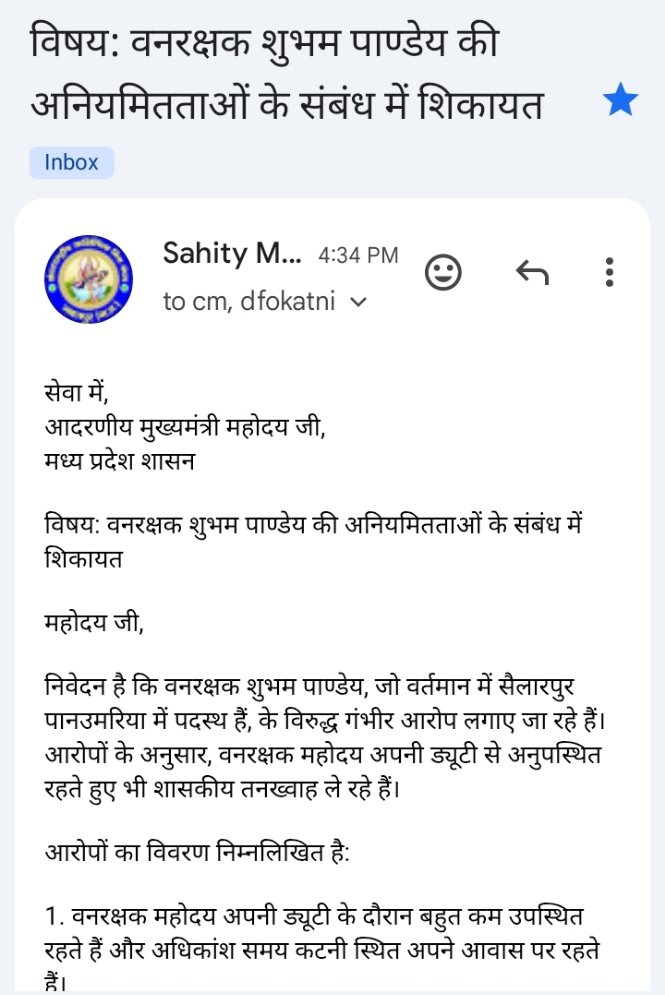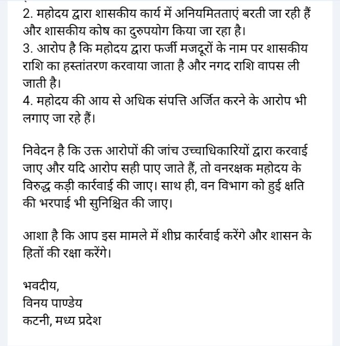 है। में जनमानस ने मांग की वनरक्षक शुभम पाण्डेय की अनियमितताओं के संबंध में शिकायत की गई है। इसमें आरोप लगाया गया है कि वनरक्षक महोदय अपनी ड्यूटी से अनुपस्थित रहते हुए भी शासकीय तनख्वाह ले रहे हैं। वो शासकीय तिलक कालेज के पीछे वातानुकूलित महल में आराम करते हैं इसके अलावा, उन पर शासकीय कार्य में अनियमितताएं बरतने, शासकीय कोष का दुरुपयोग करने, फर्जी मजदूरों के नाम पर शासकीय राशि का हस्तांतरण करवाने और आय से अधिक संपत्ति अर्जित करने के आरोप भी लगाए गए हैं। पत्र में इन आरोपों की जांच उच्चाधिकारियों द्वारा करवाने और यदि आरोप सही पाए जाते हैं, तो वनरक्षक शुभम पाण्डेय को के विरुद्ध कड़ी कार्रवाई करने की मांग की गई है।