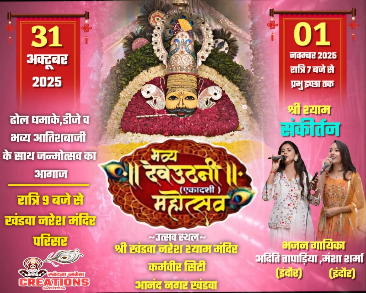 खंडवा।। कार्तिक शुक्ल पक्ष की ग्यारस के दिन देवउठनी ग्यारस के साथ ही भगवान खाटू श्याम का भी जन्मोत्सव पूरे देश भर में धार्मिक उत्साह के साथ मनाया जाता है। समाजसेवी सुनील जैन ने बताया कि श्री खंडवा नरेश श्याम मंदिर कर्मवीर सीटी आनंद नगर खंडवा में एकादशी महोत्सव का पर्व 1 नवंबर शनिवार के दिन मनाया जाएगा। भगवान खाटू श्याम के जन्मोत्सव के एक दिन पूर्व शुक्रवार को मंदिर परिसर में रात्रि में ढोल ढमाको, डीजे पर भजनो एवं आतिशबाजी के साथ जन्मोत्सव आगाज किया गया। 1 नवंबर शनिवार को श्री खंडवा नरेश श्याम मंदिर में भगवान के आकर्षक श्रृंगार के साथ शाम 7:00 बजे श्री श्याम संकीर्तन का आयोजन आयोजित होगा जिसमें भजन गायिका अदीती तापड़िया एवं मंशा शर्मा श्याम बाबा के भजनों की प्रस्तुति देंगी।