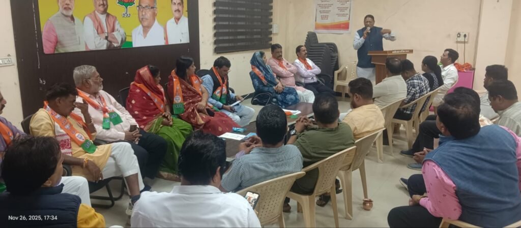 बैठक में विधायक कंचन तनवे, महापौर अमृता यादव, जिलापंचायत अध्यक्ष पिंकी वानखेड़े, हरीश कोटवाले, सेवादास पटेल, जिला महामंत्री संगठन विधानसभा संयोजक सूरजपाल सोलंकी, SIR विधानसभा प्रभारी BLA- 1 आशीष चटकेले जिला उपाध्यक्ष द्वय प्रियांशु चोरे, सुधांशु जैन, गणेश गुरबानी, सुनील जैन, अशीष राजपूत, भरत पटेल, हरीश सेन, स्नेहा पाराशर, प्रदीप यादव, रोहित मिश्रा,अनूप पटेल, फाजिल पटेल, अल्ताफ खान, दिनेश पटेल सहित वरिष्ठ कार्यकर्ता उपस्थित रहे।