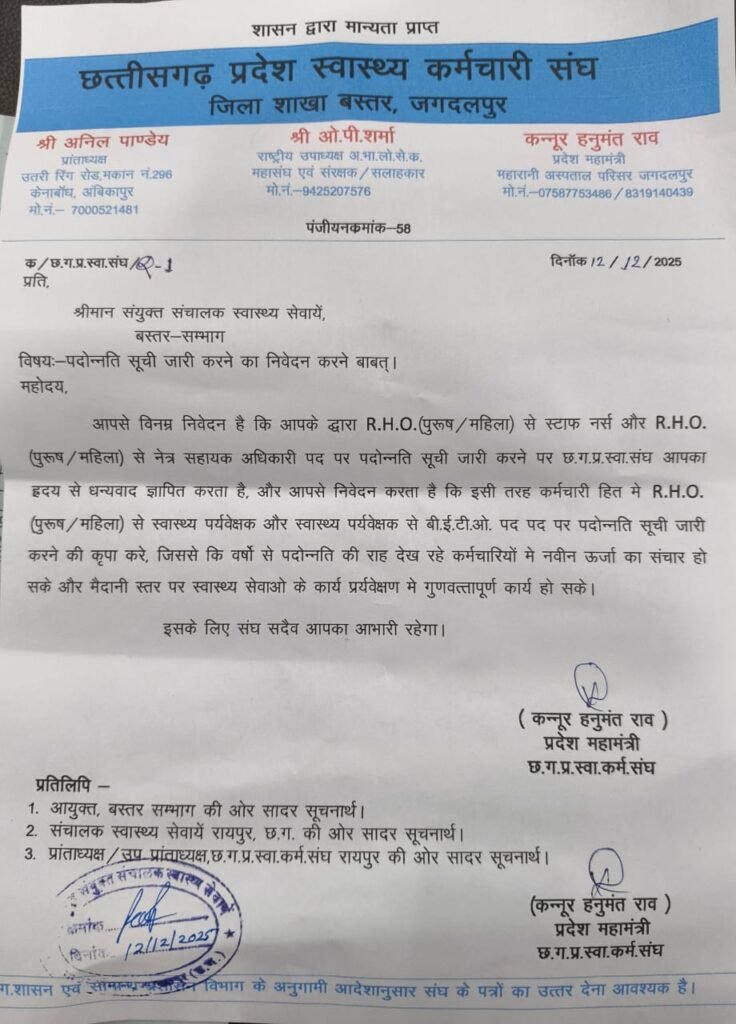 संयुक्त संचालक स्वास्थ्य सेवाएं, बस्तर संभाग, डॉक्टर महेश सांडिया को ज्ञापन देने वालों में प्रमुख रूप से संघ के उपप्रांतअध्यक्ष मोहम्मद शकील खान ,महामंत्री कन्नूर हनुमंत राव,जिला पदाधिकारी स्मिता कच्छ संभागीय पदाधिकारी साइना खान दुर्रानी, तारकेश्वर राव और फिजियोथेरेपी विभाग से डॉक्टर रुपेश खेडूलकर।