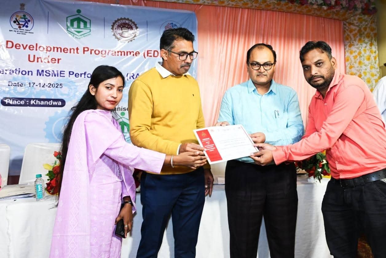 उद्यमिता विकास केन्द्र भोपाल द्वारा खण्डवा में बुधवार को जिला व्यापार एवं उद्योग केन्द्र खण्डवा के सहयोग से “राइजिंग एंड एक्सीलेरेटिंग एमएसएमई परफार्मेन्स” अर्थात “रैम्प” विषय पर एक दिवसीय कार्यशाला आयोजित की गई। कार्यशाला में जिले के उद्यमियों को प्रशिक्षण दिया गया। सैडमैप खंडवा के जिला समन्वयक श्री जमील कुरैशी ने बताया कि उद्यमिता विकास केन्द्र मध्यप्रदेश सेडमेप जिला खण्डवा द्वारा स्थानीय होटल में बुधवार को जिले के उद्यमियों के लिये जिला व्यापार एवं उद्योग केन्द्र के सहयोग से प्रदर्शन में सुधार एवं तेजी एमएसएमई विषय पर कार्यशाला आयोजित की गई। कार्यशाला में जिले के सभी उद्यमियों ने सहभागिता कर प्रशिक्षण प्राप्त किया।