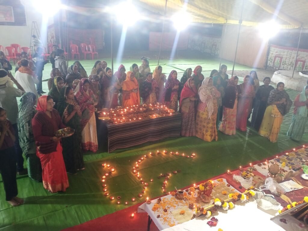 श्री नीलकंठेश्वर वार्ड में चल रही श्रीमद् भागवत कथा के दूसरे दिन बाहेती कॉलोनी स्थित गायत्री मंदिर पर महाकाल मंडल गायत्री परिवार खंडवा के तत्वाधान में मंगलवार शाम को *108 दीप प्रज्वलित कर ओम् की आकृति बनाकर* किया गया *भव्य दीपयज्ञ* यह जानकारी गायत्री परिजन श्री देवा भावसार ने दी उन्होंने बताया कि श्रीमद् भागवत कथा वाचक परम पूज्य गुरुदेव पंडित श्री विजय जी शास्त्री के मधुर वचनों से श्री कृष्ण जी की बाल लीलाओं का सुंदर वर्णन किया गया, और संगीत में भजनों से सभी का मन मोह लिया जिसमें *श्री कृष्ण गोविंद हरे मुरारी हे नाथ नारायण वासुदेवा* यह भजन सुनाया गया भजनों की प्रस्तुति सुनकर सभी महिलाओं ने नृत्य भी किया, इस शुभ अवसर पर कथा यजमान श्री राजेश वाजपेयी एवं गायत्री महिला मंडल, बाहेती कॉलोनी निवासी, महाकाल मंडल के गायत्री परिजन, बड़ी संख्या में मातृशक्ति उपस्थित रहीं, श्रीमद् भागवत कथा का समय दोपहर 1 बजे से 5, बजे तक रहेगा, कथा का समापन और पूर्णाहुति 17 जनवरी को होगी।।