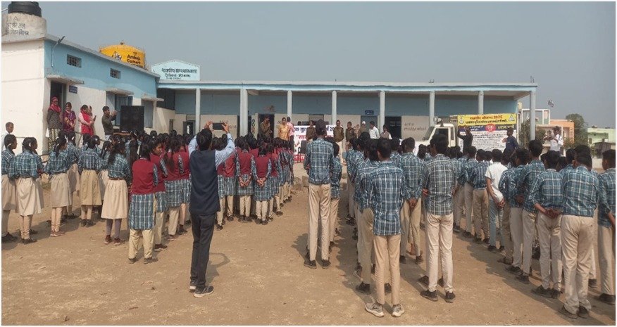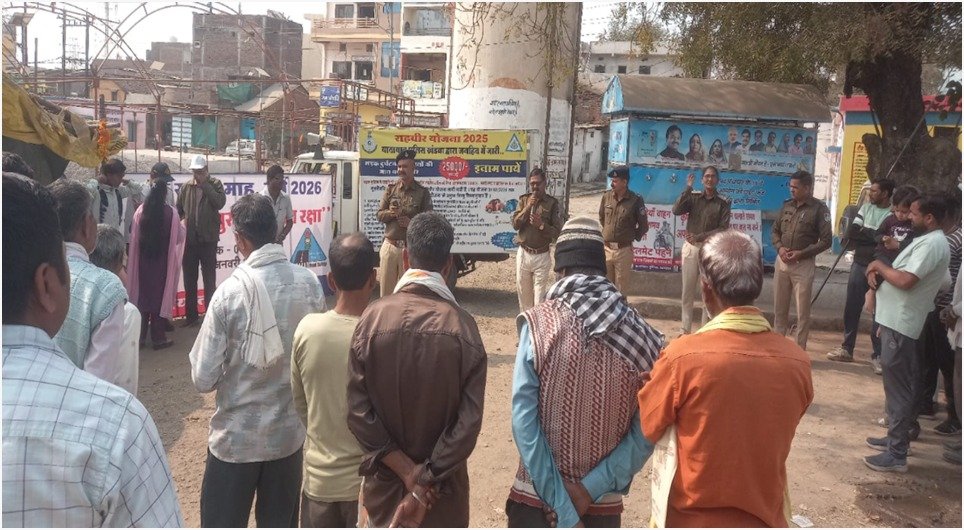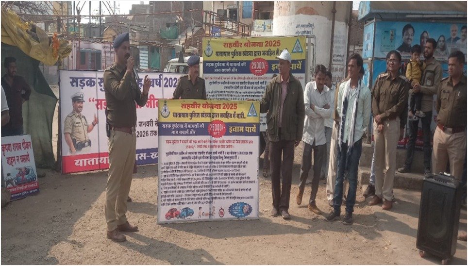 पुलिस अधीक्षक खंडवा श्री मनोज कुमार राय के निर्देशन में दिनांक 19.01.2025 को जिले में 01 जनवरी से 31 जनवरी 2026 तक चलाये जा रहे यातायात जागरूकता अभियान के अंतर्गत उप पुलिस अधीक्षक यातायात श्री अनिल कुमार राय मार्गदर्शन मे थाना प्रभारी यातायात निरीक्षक देवेंद्र सिंह परिहार, सूबेदार धर्मेन्द्रसिंह गौर एवं छैगांव माखन थाने की टीम द्वारा सीएम राईज स्कूल में 250 बच्चे एवं बस स्टेण्ड पर 150 आम नागरिको को नुक्कड नाटक के माध्यम से यातायात के नियमो के बारे में बताया जिसके अन्तर्गत दो-पहिया वाहन चलाते समय हेलमेट, चारपहिया वाहन चलाते समय सीटबेल्ट पहनने की सलाह दी गई, सड़क दुर्घटना से घायल व्यक्ति को समय पर अस्पताल पहुंचाने की महत्वता समझाते हुए राहवीर योजना की जानकारी दी गई, शहर में इन्दिरा चौक, बस स्टेण्ड पर 20-25 ट्रेक्टर ट्राली के पीछे स्टाफ द्वारा निर्धारित मानको के अनुरुप रिफ्लेक्टिव रेडियम लगवाये गये इन रेडियम पट्टियों से रात के समय वाहनों की दृश्यता बढ़ेगी और दुर्घटनाओं की संभावना कम होगी।