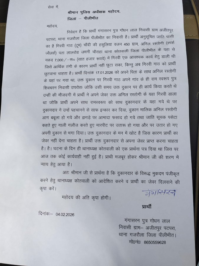 दबंग व्यापारी के इस व्यवहार से आहत होकर पीड़ित व्यक्ति ने पुलिस अधीक्षक (SP) के पास पहुंचकर अपनी व्यथा सुनाई है। पीड़ित ने प्रार्थना पत्र सौंपकर न्याय की गुहार लगाई है और मांग की है कि उसके गिरवी रखे जेवर वापस दिलाए जाएं तथा आरोपी व्यापारी के खिलाफ सख्त कानूनी कार्रवाई की जाए।