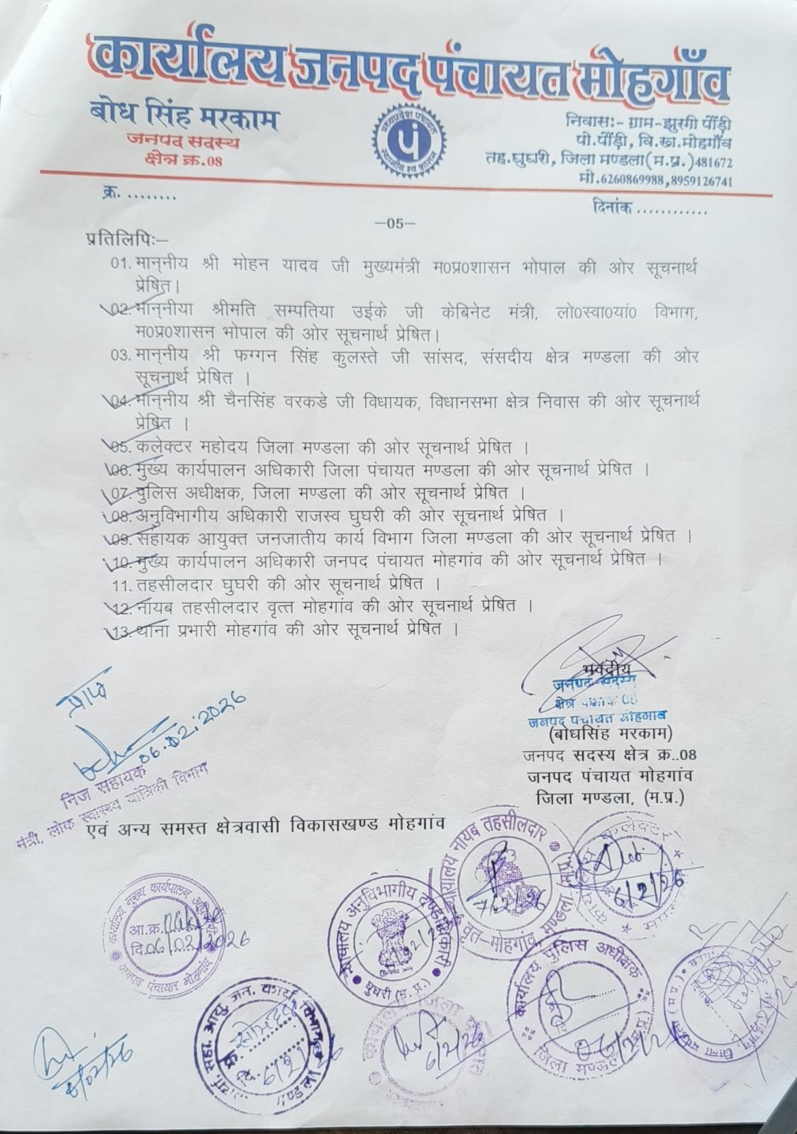 मोहगांव। विकासखण्ड मोहगांव, जिला मण्डला अंतर्गत विभिन्न समस्याओं के निराकरण न होने पर सामूहिक हड़ताल एवं धरना, आंदोलन के संबंध में सूचना ज्ञापन, विभिन्न समस्याओं को लेकर विगत वर्षों से अनेकों बार पत्राचार किया गया है, किन्तु समस्याओं का आज दिनांक तक कोई निराकरण नहीं किये जा रहे है। इससे परेशान होकर समस्त क्षेत्रवासियों द्वारा यह निर्णय लिया गया है कि सात दिवस के अंदर है, तो आगामी दिवस दिनांक 13.02.2026 से विकासखण्ड मोहगांव के क्षेत्रवासियों के साथ एकत्रित होकर बड़ चौराहा मोहगांव में अनिश्चित कालीन हड़ताल एवं घरना प्रदर्शन किया जावेगा, जिसकी सम्पूर्ण जबावदारी शासन प्रशासन की होगी । अर्थात दिनांक 12.02.2026 तक उल्लेखित समस्याओं का समाधान नहीं किया जाता