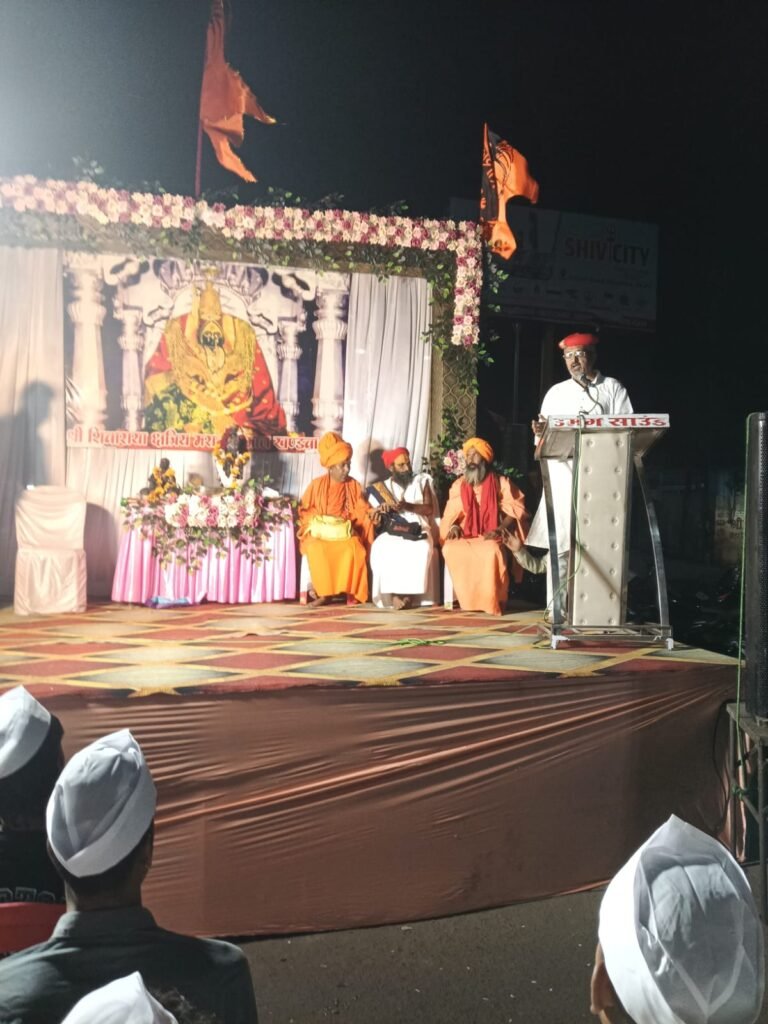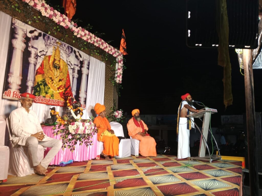 सबसे पहले मंच पर विराजित प्रतिमा श्री शिवाजी महाराज जी को गुलाल एवं माल्यार्पण कर आरती की गई एवं प्रसादी भोग लगाया गया उसके पश्चात महाराज की जीवनी पर प्रकाश डाला गया उनके जन्म से लेकर के अंतिम समय तक बचपन से लेकर छत्रपति की उपाधि मिलने तक *लव जोशी* द्वारा वर्णन किया गय उनके जन्म के लिए उनकी माता जिजाऊ ने मां शिवराय से मन्नत की थी और मन्नत का ही यह फल है कि उनकी गोद भरी और बालक का जन्म हुआ जन्म के बाद माता-पिता को नाम के लिए मंथन करना पडा और मंथन में मां शिवराय के नाम पर बालक का नाम शिवाजी रखा गया जन्म के बाद पिता अपने सैन्य कार्य में व्यस्तता के कारण समय नही दे पाए और मां ने ही पूरा अपना दायित्व निभाया शिवाजी के पालन पोषण करने में और माताजी जो ने ही शिवाजी को गीता ज्ञान रामायण महाभारत महाराणा प्रताप जैसी उनके जीवन के बारे में शिवाजी को शिक्षा प्रदान की गई एवं उनमें शौर्य दृढ़ता देश और जनता के लिए अपना प्रेम बलिदान जैसी भावना और देश के लिए लड़ने का हौसला दिया एवं शिवाजी महाराज ने तीन कामो में महारथी हासिल की थी पहाड़ों पर चढ़ना उतरन जंगलों में निडर ता से रहना और अपने दुश्मनों को गोरिल युद्ध से हमला कर खत्म करना हरण एवं समुद्र में उतारकर युद्ध करना और अपने दुश्मनों को पराजित कर जीत हासिल करना ऐसे निपुण कार्य एवं हिंदू स्वराज के संस्थापक बने एवं औरंगजेब को मारकर छत्रपति शिवाजी महाराज की उपाधि प्राप्त की संत त्यागी जी ने महाराज के जीवन पर प्रकाश डाला और कहां हमारा देश हिंदू था राष्ट्रहैं हिंदू हैॉ और हिन्दू राष्ट्र रहेगा इस को कोई नहीं झूठला सकता लेकिन हमें अपनी एकता अपने घर से ही लानी होगी तब ही हम बाहर लड़ सकते हैं वरना हम एक ही घर में रहकर दो भाई अलग-अलग कमरों में अलग-अलग खाना खाते हैं तो जब घर में ही एकता ना हो तो हम देश में कैसे एकता ला सकेंगे बहुत ही अच्छा वर्णन किया त्यागी जी महाराज ने एवं युवा वक्त के रूप में साहिल चौहान ने भी उनके जीवन पर बहुत ही सुंदर वर्णन किया और बहुत ही बढ़िया शब्दों बोला एवं मुगल शासको को पराजित किया औरंगज़ेब आदिलशाह जैसे राजाओं के ऊपर कटाक्ष करते हुए बहुत ही सुंदर और जानदार आवाज मे मुगलो को कैसे पराजित किया शिवाजी ंहाराज ने यह सब बताया और जो उनके शब्द रहते थे वह शब्दो का उन्होंने अपने शब्दों से बोलकर सुनाया