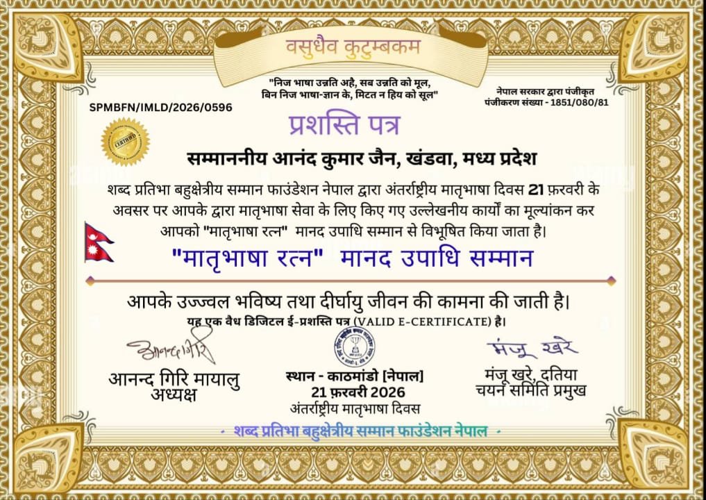 नेपाल की प्रतिष्ठित संस्था द्वारा आनंद जैन मातृ भाषा रत्न मानक उपाधि से हुए सम्मानित।
