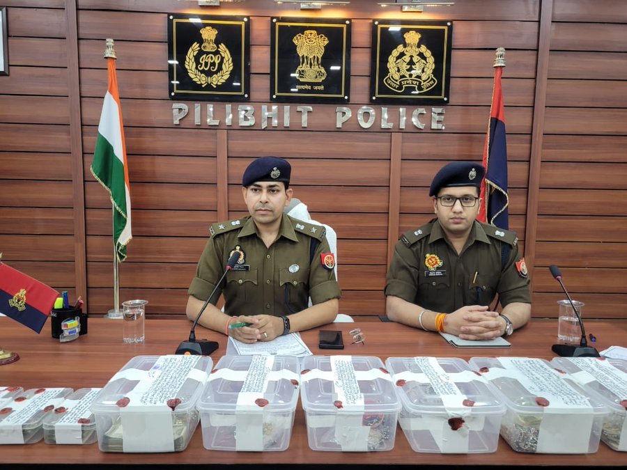 पीलीभीत। जनपद में अपराध और अपराधियों के विरुद्ध चलाए जा रहे अभियान में सुनगढ़ी पुलिस और SOG टीम को बड़ी सफलता हाथ लगी है। पुलिस अधीक्षक सुकीर्ति माधव मिश्र ने एक प्रेस कॉन्फ्रेंस के दौरान कलेक्ट्रेट के पूर्व प्रशासनिक अधिकारी के घर हुई बड़ी चोरी का पर्दाफाश किया। पुलिस ने दो महिलाओं समेत कुल 6 शातिर चोरों को गिरफ्तार कर उनके पास से भारी मात्रा में सोना, चांदी और नकदी बरामद की है।