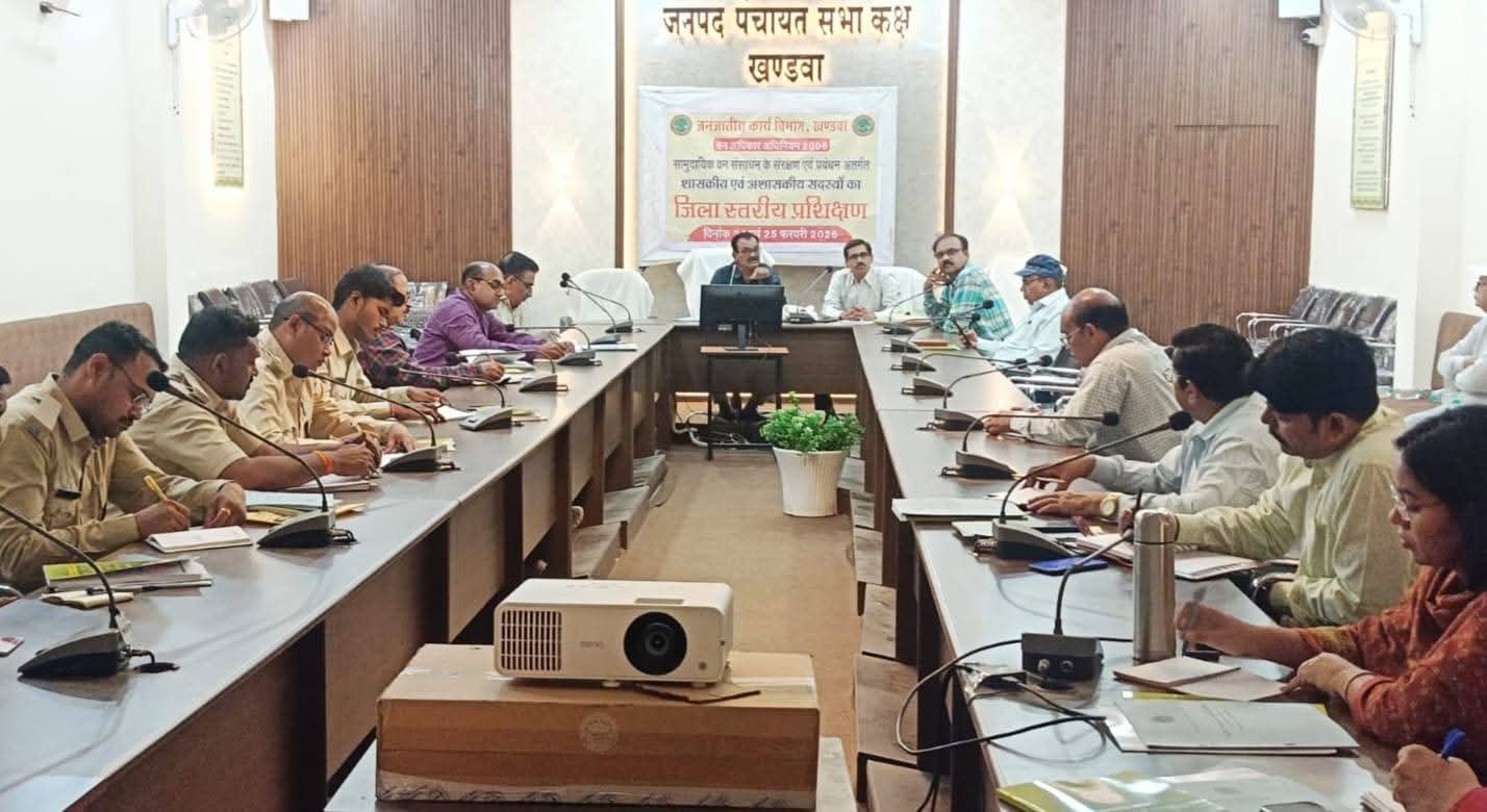 खण्डवा//वन अधिकार अधिनियम 2006 के तहत सामुदायिक वन संसाधन के संरक्षण एवं प्रबंधन सम्बंधी ओरियंटेशन प्रोग्राम जनपद पंचायत खण्डवा के सभागृह में मंगलवार को सम्पन्न हुआ। कार्यक्रम में भोपाल से आए मास्टर ट्रेनर श्री राजेश कनोजे एवं श्री वीरेंद्र दुबे ने वन अधिकार की आवश्यकता तथा उपयोगिता पर विस्तार से जानकारी दी। उन्होंने वन अधिकार अधिनियम के अंतर्गत सामुदायिक दावे तैयार करने तथा ग्राम, उपखंड व जिला स्तर पर समितियों के गठन की प्रक्रिया के बारे में जानकारी दी। सहायक आयुक्त श्री संतोष शुक्ला ने बताया कि प्रशिक्षण में सभी एसडीएम, जनपद सीईओ, वन विभाग के अनुविभागीय अधिकारी तथा वन एवं जनजातीय कार्य विभाग के मास्टर ट्रेनर्स भी उपस्थित थे।