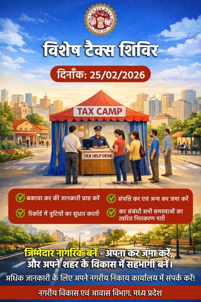 खंडवा। संचालनालय नगरीय प्रशासन एवं विकास, मध्यप्रदेश के निर्देशानुसार नगर पालिक निगम खंडवा द्वारा दिनांक 25 फरवरी 2026 को नगर क्षेत्र में बकाया करों एवं नगरीय शुल्कों की वसूली हेतु विशेष अभियान चलाया जाएगा। इस अभियान के अंतर्गत शहर के विभिन्न वार्डों में वार्डवार विशेष वसूली शिविर आयोजित किए जा रहे हैं, ताकि नागरिकों को अपने क्षेत्र के समीप ही कर भुगतान की सुविधा मिल सके।