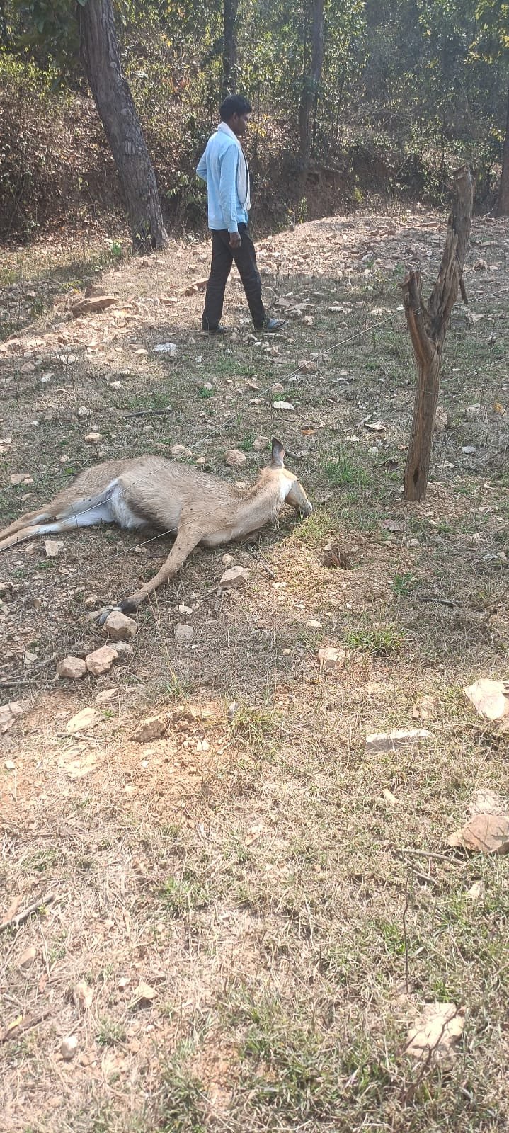 बृजेश कुमार सोनभद्र रिपोर्ट विंन्ढमगंज वन विभाग क्षेत्र के घिचोरवा चौकी से 500 मीटर दुरी पर एक जंगली जानवर नील गाय किसान द्वारा बिजली के तार घेर कर करेंट लगने से मृतक होने का मामला प्रकाश में आया है बताते चले की घिचोरवा निवासी जय शंकर गुप्ता अपने खेत में जंगली जानवर एवं पालतू जानवर के अपने खेत के बचाव के बिजली की तार से घेराई किया था इसी बीच दिनांक 24 फरवरी को रात में एक जंगली जानवर नील गाय करेंट लगने मौत हो गयी सुबह ग्रामीणों द्वारा देखा गया जिसकी सुचना वन विभाग के क्षेत्रीय अधिकारी इमरान खान को बताया सुचना मिलते ही क्षेत्रा अधिकारी ने अपने अपने कर्मचारी को मौके पर भेज कर नील गाय जय शंकर द्वारा मिट्टी में पाट दिया गया था वन विभाग के कर्मचारीयों ने मिट्टी से निकलवाया और पोस्टमार्टम के लिए रघुवर सूर्य प्रकाश सोहर लाल इत्यादि ग्रामीणों के मदद से ट्रेक्टर द्वारा भेजवया अब देखना है पोस्टमार्टम रिपोर्ट आने के बाद पर्यावरण बचाव अधिनियम के तहद करवाई किया जाता है या लीपा पोती करके छोड़ दिया जाता है इस बाबत में विन्ढमगंज के क्षेत्राधिकारी इमरान खान से से सेल फोन पर बात किया तो उन्होंने ने,,, पोस्टमार्टम की प्रक्रिया चालू है रिपोर्ट आने के बाद उचित कार्यवाई,,, ये बताये
