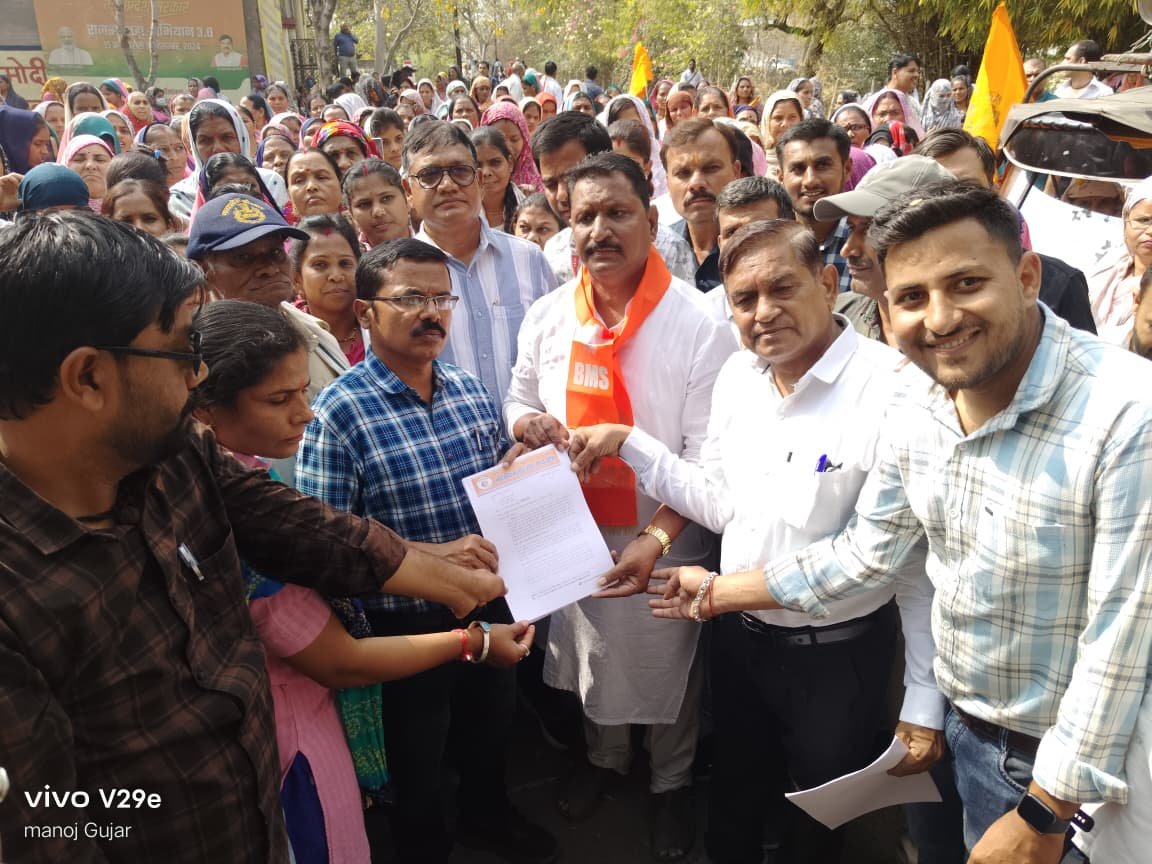 खंडवा। भारतीय मजदूर संघ द्वारा केंद्र एवं राज्य सरकार की श्रमिक-विरोधी नीतियों के विरोध में आयोजित “विरोध दिवस” के अंतर्गत आज विशाल रैली निकालकर धरना-प्रदर्शन किया गया तथा तत्पश्चात जिला प्रशासन को ज्ञापन सौंपा गया। यह ज्ञापन मोहन यादव के नाम सिटी मजिस्ट्रेट के माध्यम से प्रेषित किया गया।