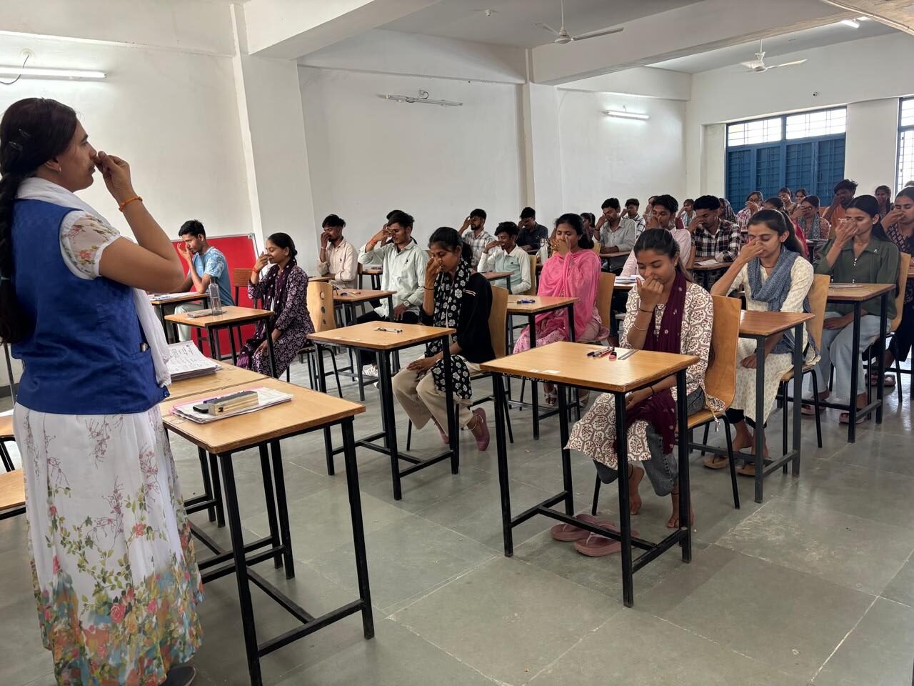 कार्यशाला में डॉ. वंदना पारकर ने विद्यार्थियों को अपने स्थान पर बैठे-बैठे किए जाने वाले सरल योग अभ्यासों की जानकारी दी। उन्होंने बताया कि नियमित योग, प्राणायाम और ध्यान से न केवल मानसिक तनाव कम होता है, बल्कि ऊर्जा का स्तर भी बना रहता है तथा शारीरिक स्वास्थ्य में सकारात्मक सुधार होता है।