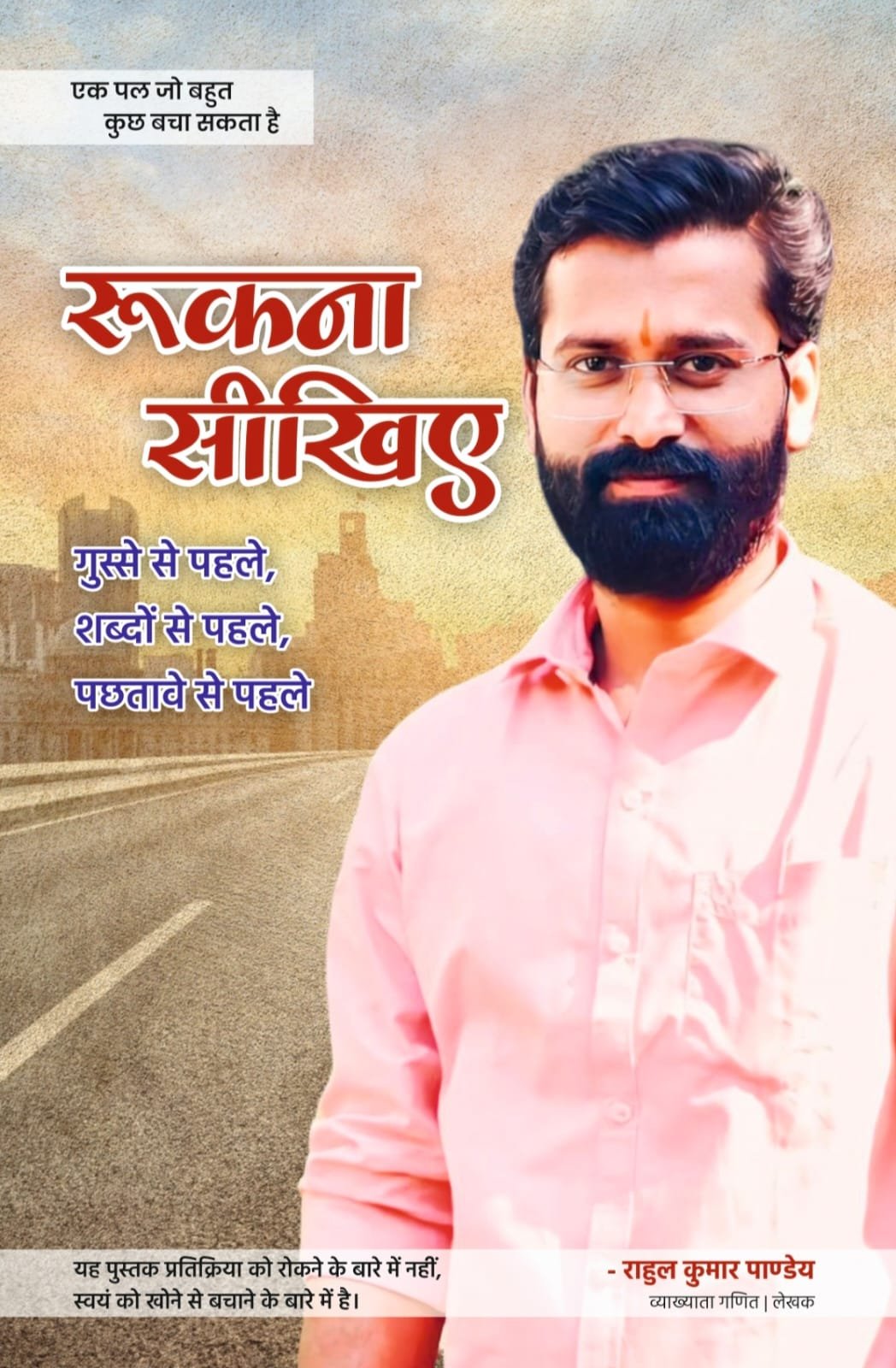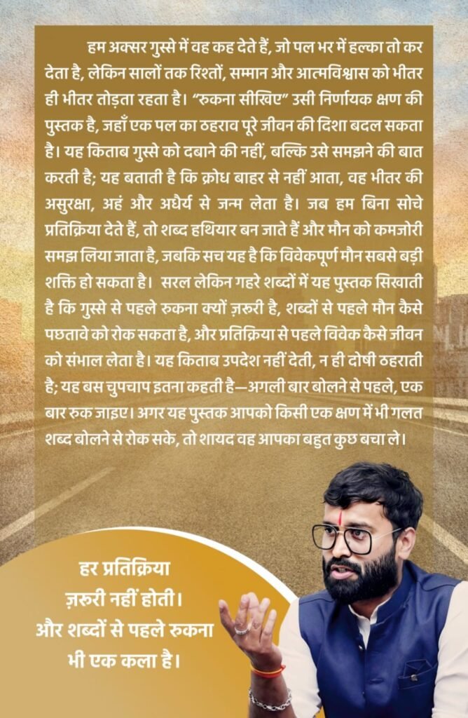 आज के समय में जब लोग अधिक बोलना चाहते हैं लेकिन सुनने का धैर्य कम होता जा रहा है, छोटी-छोटी बातों पर क्रोध और त्वरित प्रतिक्रिया सामान्य होती जा रही है, ऐसे दौर में बस्तर के युवा लेखक राहुल कुमार पांडेय की नई पुस्तक “रुकना सीखिए” पाठकों के सामने एक गंभीर और विचारशील दृष्टि प्रस्तुत करती है। यह पुस्तक आज प्रकाशित हुई है और प्रमुख ऑनलाइन पुस्तक विक्रय मंचों अमेज़न, फ्लिपकार्ट तथा गूगल प्ले पुस्तकें पर उपलब्ध है। यह पुस्तक आधुनिक जीवन की उस मानसिक स्थिति को समझाने का प्रयास करती है जिसमें मनुष्य बिना सोचे-समझे प्रतिक्रिया देने लगता है। पुस्तक का केंद्रीय संदेश यह है कि जीवन के कई बड़े पछतावे केवल कुछ क्षण रुककर और सोचकर टाले जा सकते हैं।