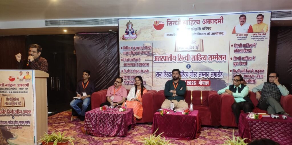 खंडवा। मध्यप्रदेश संस्कृति परिषद, मध्यप्रदेश शासन, संस्कृति विभाग भोपाल के तत्वावधान में आयोजित दो दिवसीय अंतर प्रांतीय सिंधी साहित्य सम्मेलन एवं संत हिरदाराम साहित्य गौरव सम्मान समारोह का दिव्तीय दिवस रविवार को अतिथियों व्दारा माँ सरस्वती, माँ हिगलाज, भगवान श्री झुलेलाल एवं परम् श्रद्धेय संत हिरदाराम जी के छाया चित्र पर माल्यार्पण एवं दीप प्रज्ज्वलित कर सत्र आरम्भ हुआ। यह जानकारी देते हुए राष्ट्रीय सिंधी समाज प्रदेश प्रवक्ता निर्मल मंगवानी ने बताया कि प्रथम सत्र सिन्धी साहित्य में महिला विमर्श विषय में मुख्य वक्ता डॉ. विम्मी सदारंगाणी ने आज की महिलाओं के सोच एवं स्वत्रंत रहन सहन पर पाश्चात्य संस्कृति के समावेश का विस्तृत उल्लेख कर अपना सारगर्भित आलेख प्रस्तुत कर उपस्थित महिलाओं को पुरूष के प्रति अपना नजरिया बदलने की बात कर आत्म मंथन के लिये मजबूर कर दिया। विषय की भूमिका द्रोपदी चंदनाणी एवं सत्र की अध्यक्षता डॉ. कमला गोकलाणी, अतिथि के रूप में शत्रुघ्न केशवाणी, महेश मूलचंदानी, सिंधी साहित्य अकादमी निदेशक राजेश वाधवानी रहे। संचालन चित्रा चेलाणी ने किया। दिव्तीय सत्र में सिन्धी साहित्य में युवा विमर्श विषय पर मुख्य वक्ता प्रकाश तेजवाणी ने युवाओं की महत्वपूर्ण भूमिका पर प्रकाश डाला। सत्र की अध्यक्षता अशोक जमनानी एवं विषय की भूमिका प्रिया वछाणी ने बांधी। संचालन सागर उदासी किया। तृतीय सत्र में सिन्धी साहित्य में अनुवाद स्थिति, संभावना, महत्व और ज़रूरी कोशिशें विषय पर मुख्य वक्ता रश्मि रामाणी ने आलेख प्रस्तुत किया। विषय की भूमिका डॉ. नादिया मसंद, अध्यक्षता अशोक मनवाणी, अतिथि के रूप में कविता ईसरानी उपस्थित थी। संचालन राकेश शेवाणी ने किया। सिंन्धी और संस्कृत का नाता विषय पर संस्कृत के मंत्र से शुरूआत करते हुए मुख्य वक्ता डॉ. जितेंद्र थडाणी ने आलेख के माध्यम से कहा कि किसी भी भाषा को देखने के लिये पांच शब्दों की जरूरत होती है। आज के समय हमारी बोल चाल की भाषा में अधिकांश शब्द संस्कृत के समाहित हैं। अनेक सिन्धी शब्दों को संस्कृत से तालमेल कर बताया गया। अध्यक्षता हरीश करमचंदानी ने की। अतिथि के रूप में राजेन्द्र सचदेव मौजूद थे। विषय की भूमिका डॉ. चारुमित्रा माखीजानी रानाडे जी ने बांधी। सत्र संचालन विनीता मोटलाणी ने किया। इस मौके पर अहमदाबाद के वरिष्ठ सिन्धी साहित्यकार डॉ. जेठो लालवानी, भगवान बाबाणी, डॉ संतोष खत्री धुलिया, राजकुमार बसंत, नारी लच्छवानी, द्रोपती चांदवानी, निर्मंल मंगवानी, मनीष मलानी खंडवा, मुरलीधर चंदवानी, कोल्हापुर, कशिश सीतलानी, राजेन्द्र सचदेव इंदौर, सुरेश पारवानी, बैरागढ़, भोपाल, मध्यप्रदेश, छत्तीसगढ़, उत्तरप्रदेश अयोध्या, गुजरात आदिप