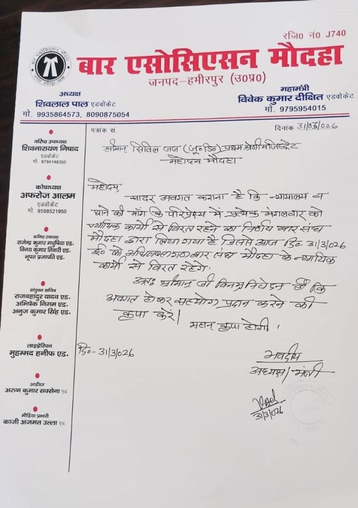 अधिवक्ता जयहिंद , सुधाकर शर्मा, आदित्य त्रिपाठी, विवेक दीक्षित, जयप्रकाश शुक्ला , वहीद खान, अवनीश कुमार, निहाल खान, संदीप प्रजापति, नन्हे यादव व जावेद अहमद सहित उपस्थित तमाम अधिवक्ताओं ने बताया कि पिछले लगभग 5 वर्षों से बिवार व मुस्करा थानों से संबंधित वादों को न्यायालय सिविल जज जूनियर डिविजन मौदहा में शामिल करने की मांग बार एसोसिएशन मौदहा द्वारा की जा रही है, ताकि वादकारियों को लगभग 50 किमी लंबी दूरी तय कर हमीरपुर न जाना पड़े। बिवार व मुस्करा से मौदहा की दूरी 20 से 30 किमी है जबकि हमीरपुर की दूरी लगभग 50 किमी है। वाद क्षेत्र करीब होने से वादकारियों को समय और खर्च दोनों में राहत मिलेगी। जनहित की अपनी इसी मांग को लेकर समस्त अधिवक्ता प्रत्येक मंगलवार को न्यायिक कार्यों से विरत रहते है।जो मांग पूरी न होने तक अनवरत जारी रहेगा।
