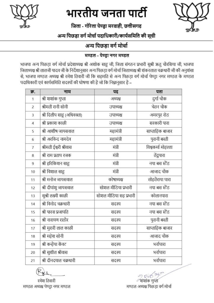 भारतीय जनता पार्टी ने संगठन विस्तार और मजबूती के उद्देश्य से आशीष जायसवाल को अन्य पिछड़ा वर्ग (ओबीसी) मोर्चा, पेंड्रा मंडल का महामंत्री नियुक्त किया है। इस नियुक्ति को संगठन के भीतर सक्रिय और जमीनी कार्यकर्ताओं को आगे लाने की रणनीति के रूप में देखा जा रहा है।